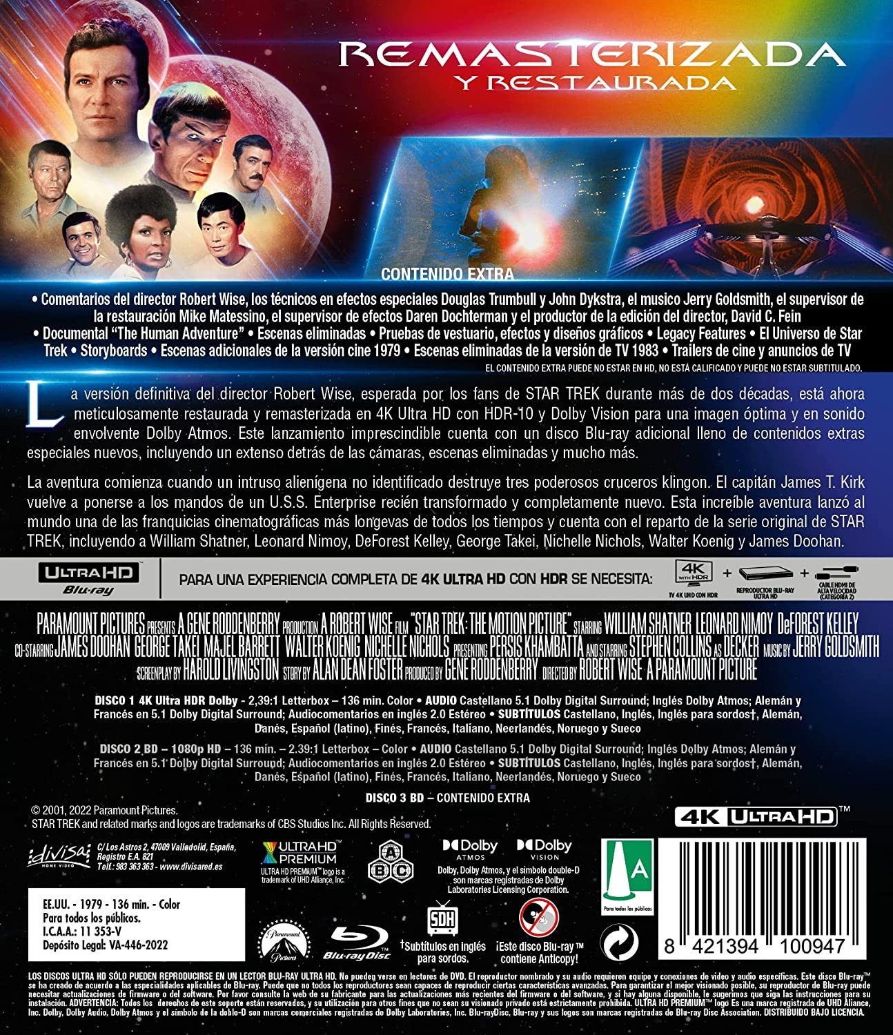 THE DIRECTOR'S EDITION Director Robert Wise's definitive version, awaited by STAR TREK fans for more than two decades, is now meticulously restored and remastered in 4K Ultra HD with HDR-10 and Dolby Vision for optimal picture and sound Dolby Atmos surround. This must-have release features a bonus Blu-ray disc packed with special new bonus content, including extensive behind-the-scenes footage, deleted scenes, and much more. The adventure begins when an unidentified alien intruder destroys three powerful Klingon cruisers. Captain James T. Kirk returns to the controls of a newly converted and brand new USS Enterprise. This incredible adventure launched one of the longest-running film franchises of all time and features the cast of the original STAR TREK series, including William Shatner, Leonard Nimoy, DeForest Kelley, George Takei, Nichelle Nichols, Walter Koenig and James Doohan. BONUS CONTENT (bonus content may not be in HD, is not rated and may not be subtitled): • Commentary by director Robert Wise, special effects technicians Douglas Trumbull and John Dykstra, musician Jerry Goldsmith, restoration supervisor Mike Matessino, Effects Supervisor Daren Dochterman and Director's Cut Producer David C. Fein • “The Human Adventure” Documentary • Deleted Scenes • Costume Tests, Effects and Graphic Designs • Legacy Features • The Star Trek Universe • Storyboards • Additional scenes from the 1979 film version • Deleted scenes from the 1983 TV version • Film trailers and TV advertisements. DISC 1: 4K Ultra HDR Dolby - 2.39:1 Letterbox – 136 min. Color • AUDIO Spanish 5.1 Dolby Digital Surround; English Dolby Atmos; German and French in 5.1 Dolby Digital Surround; Audio commentary in English 2.0 Stereo • SUBTITLES Spanish, English, English for the deaf†, German, Danish, Spanish (Latin), Finnish, French, Italian, Dutch, Norwegian and Swedish DISC 2: BD – 1080p HD – 136 min. – 2.39:1 Letterbox – Color • AUDIO Spanish 5.1 Dolby Digital Surround; English Dolby Atmos; German and French in 5.1 Dolby Digital Surround; Audio commentary in English 2.0 Stereo • SUBTITLES Spanish, English, English for the deaf†, German, Danish, Spanish (Latin), Finnish, French, Italian, Dutch, Norwegian and Swedish DISC 3: BD Extras