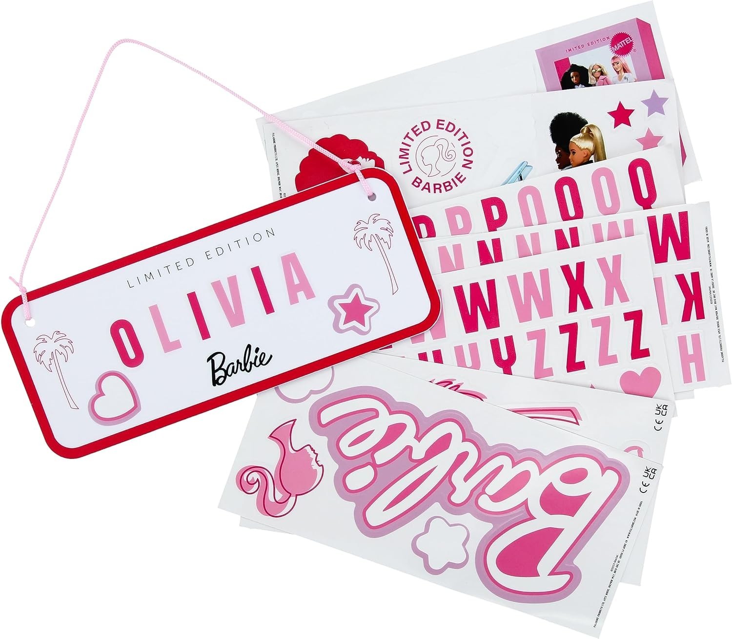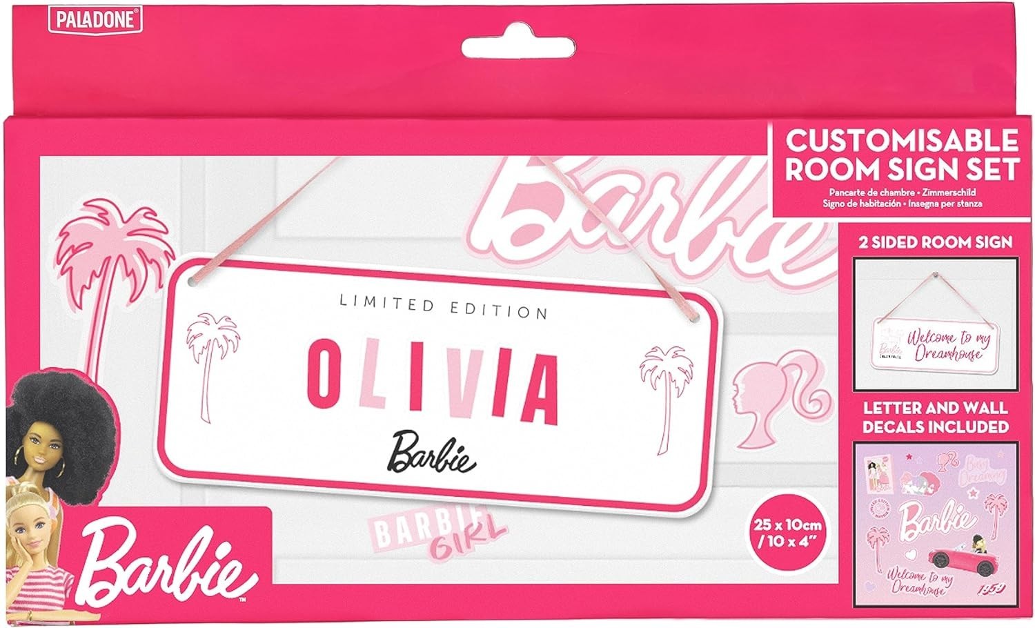 ¡Hola Barbie! Ahora podrás personalizar la entrada a tu habitación (o a tu Barbieland) con este letrero customizable de la icónica muñeca de Mattel. En este pack encontrarás un letrero de 25 x 10 cms que puedes usar por los dos lados, lazo y 8 láminas con etiquetas intercambiables de letras e iconos de la muñeca Barbie y de su mundo. Se trata de un producto de licencia oficial que será el nuevo elemento decorativo de todas las fans de Barbie. Es una creación de la marca Paladone.