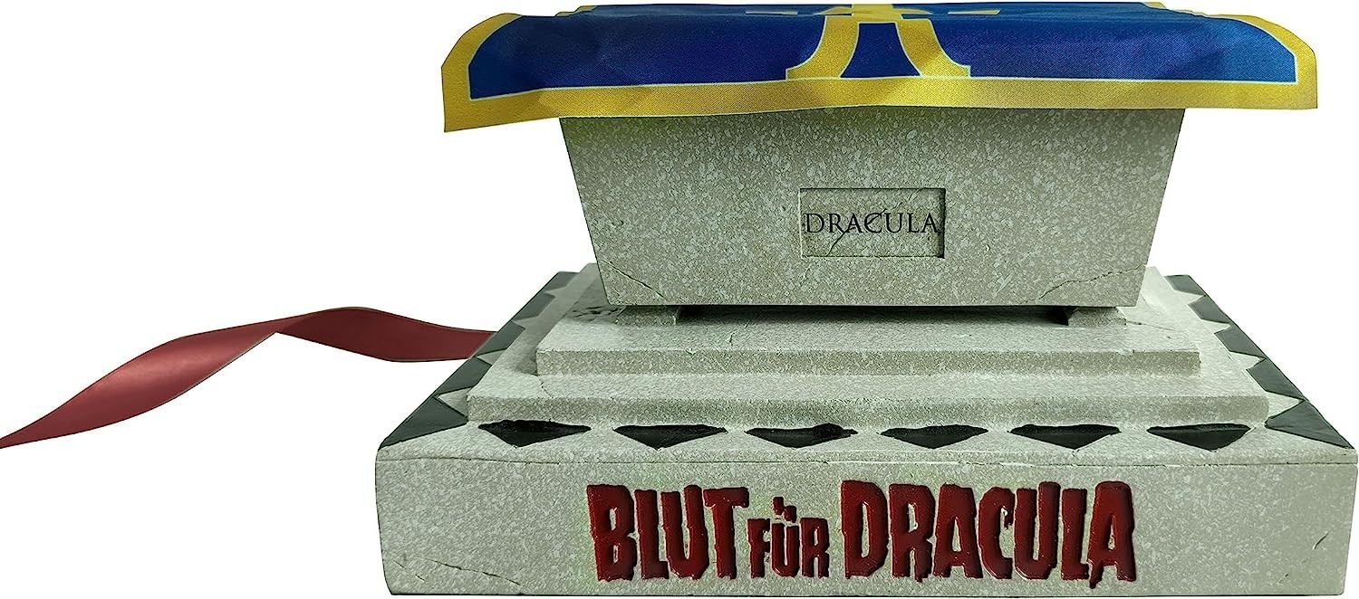 La noche tiene un nuevo regente… Christopher Lee, el estatuesco actor británico, protagonizó la película de 1966 “Blut Fur Dracula” dirigida por Terence Fisher. Esta obra de culto que se tituló “Drácula: Prince of Darkness”, llega a tu colección cinéfila en forma de impresionante display de resina para guardar tu copia de la película (no incluida). El sarcófago semi abierto con su escalinata, será la nueva pieza central de cualquier estantería en la que la coloques, dándole un toque gótico a tu salón. Viene en una caja temática con ilustraciones a todo color de la cinta de culto. Mide unos 19 cms de alto por 24 de ancho.