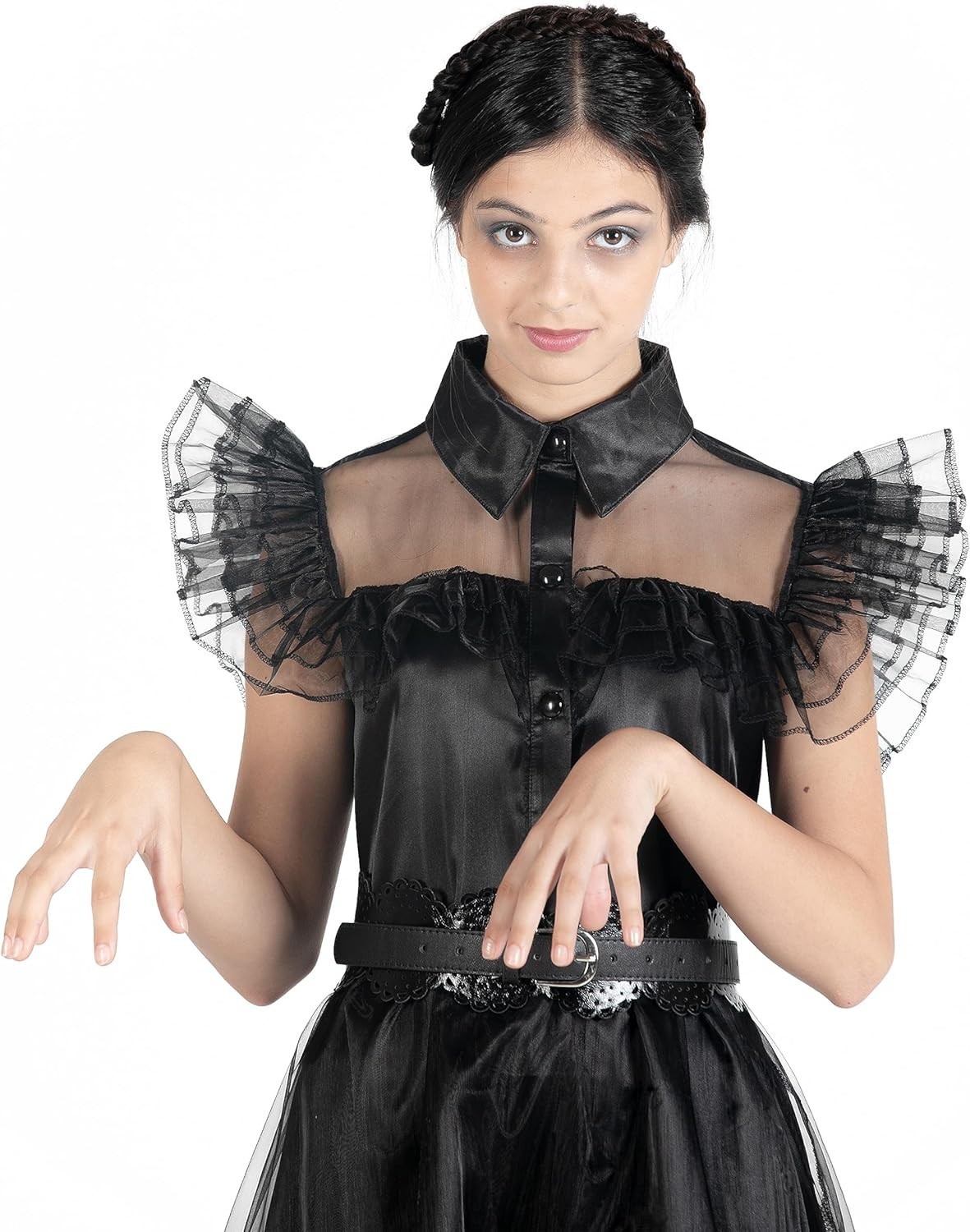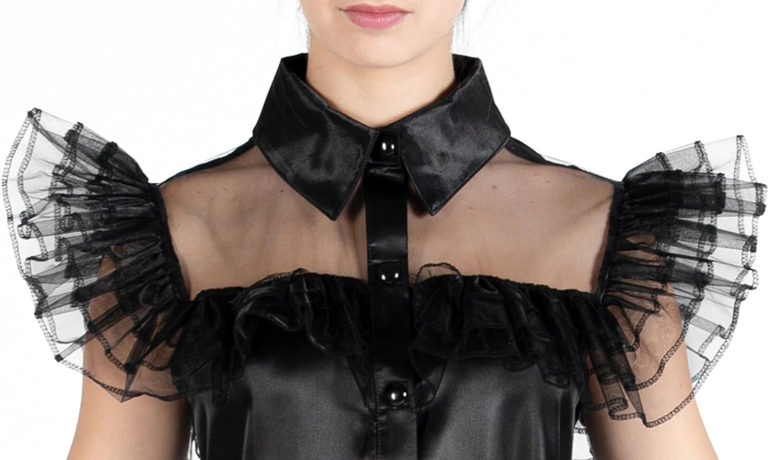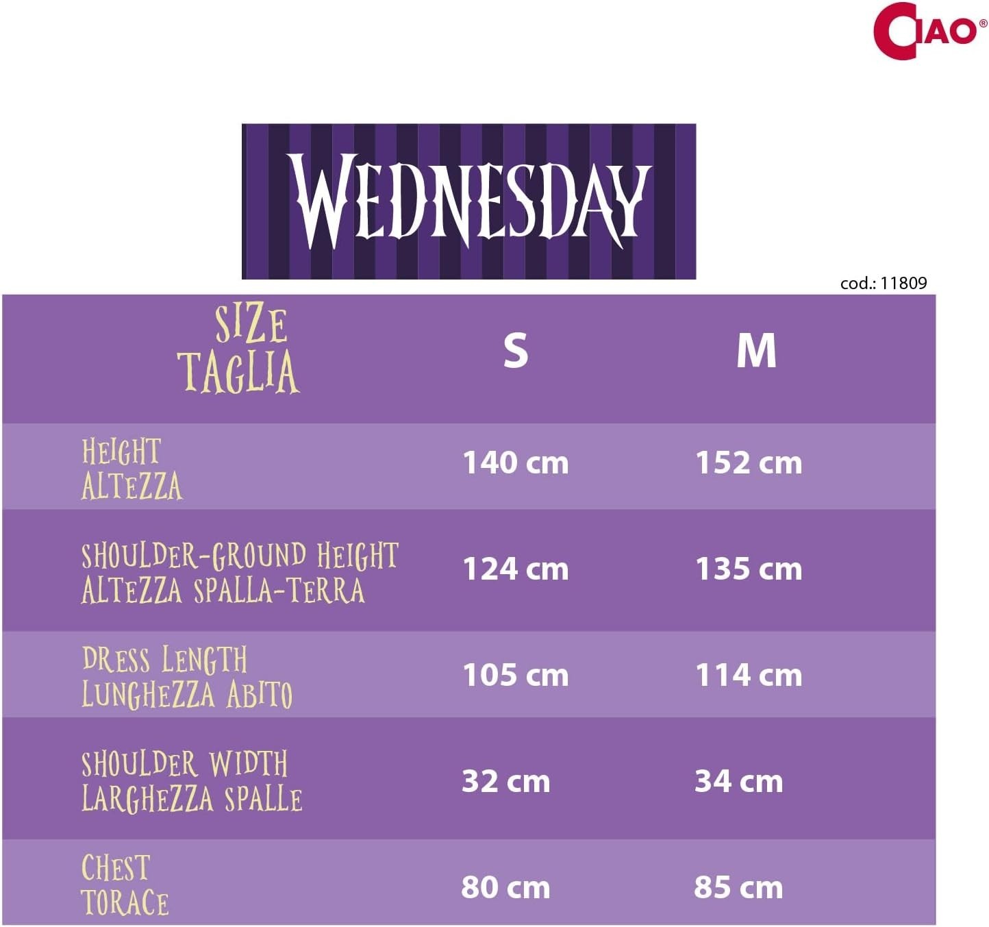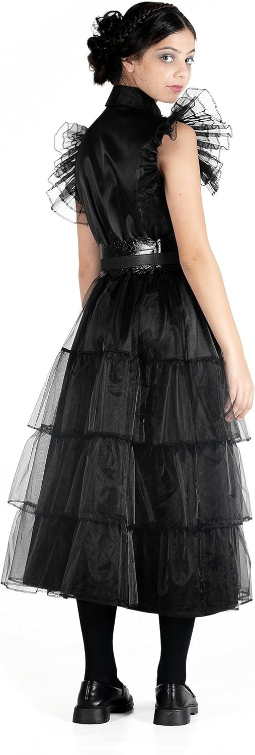 Este disfraz recrea fielmente el icónico vestido que Miércoles Addams llevó al baile. Ideal para fanáticos de la familia Addams y perfecto para eventos temáticos de Halloween o cosplay. Un disfraz que te transformará en Miércoles con estilo y autenticidad. Está basado en la famosa serie protagonizada por Jenna Ortega y producida por Tim Burton y Netflix. Es de talla M y ha sido creado por Ciao.