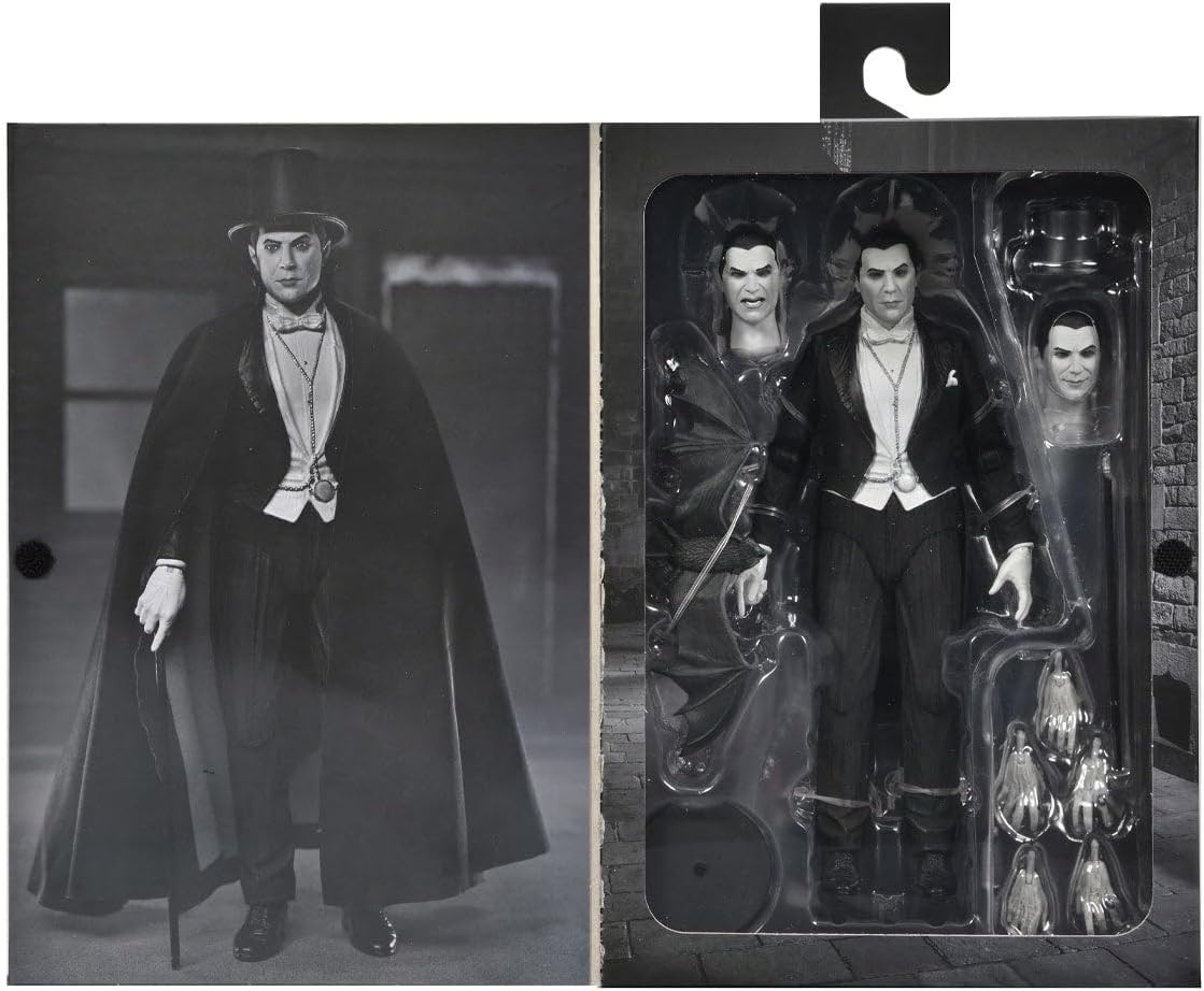 Desde las neblinosas laderas de Transilvania nos llega la figura Ultimate del Drácula de Bela Lugosi en su versión Carfax Abbey. Esta espectacular figura que respira nostalgia e historia del cine por todos lados, mide 18 cms y está articulada. Además, incluye accesorios como dos cabezas adicionales, murciélago, peana y cinco manos adicionales. Y como todas las figuras de Neca, viene en una impresionante y cuidadísima caja con tapa y arte original de la película en sus lados.