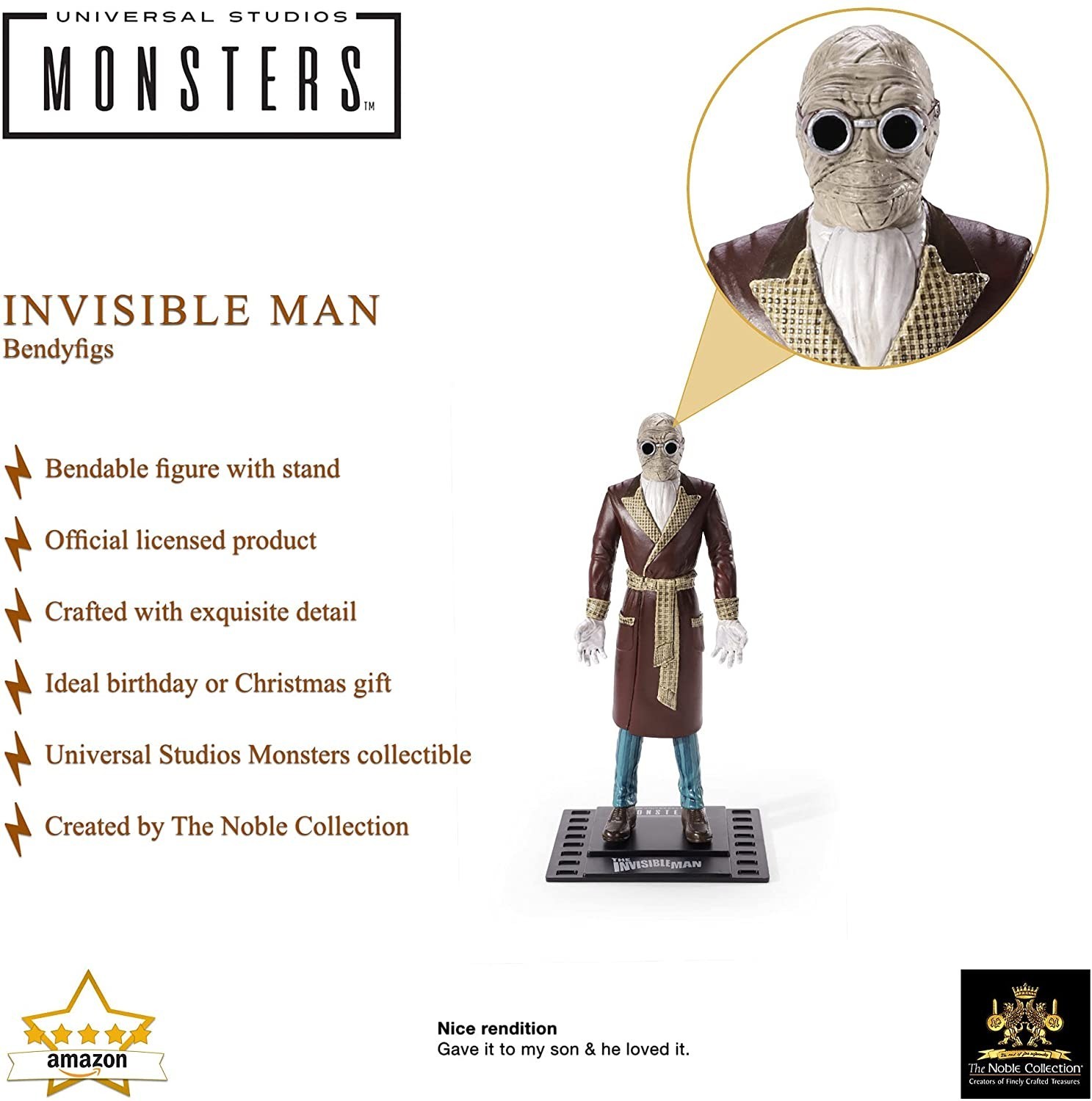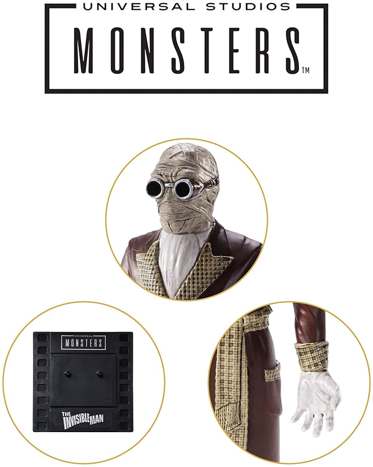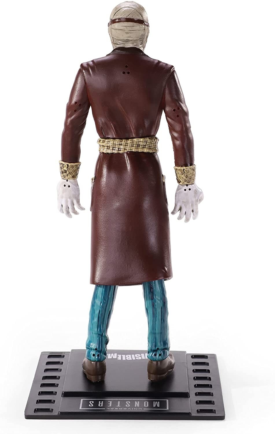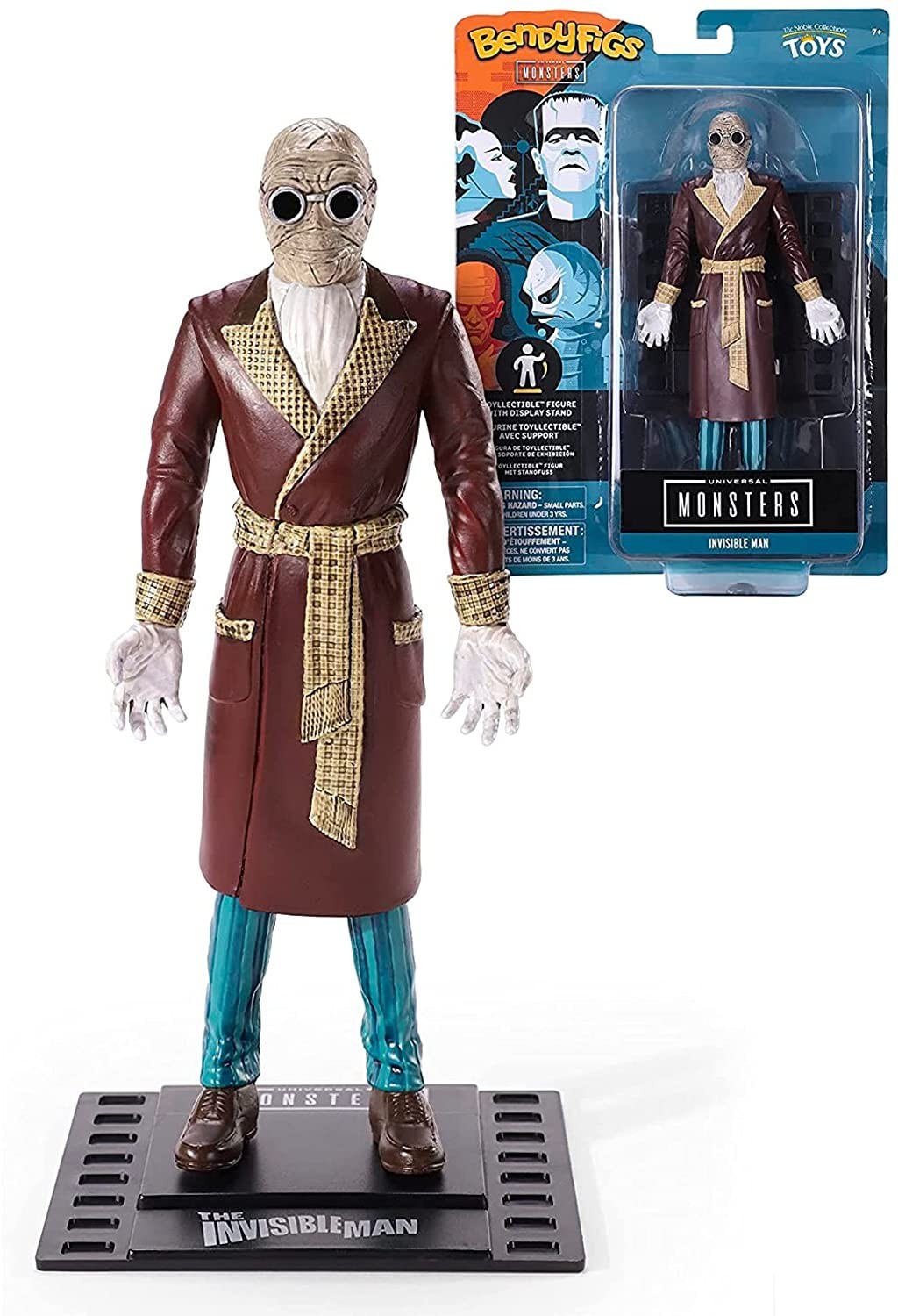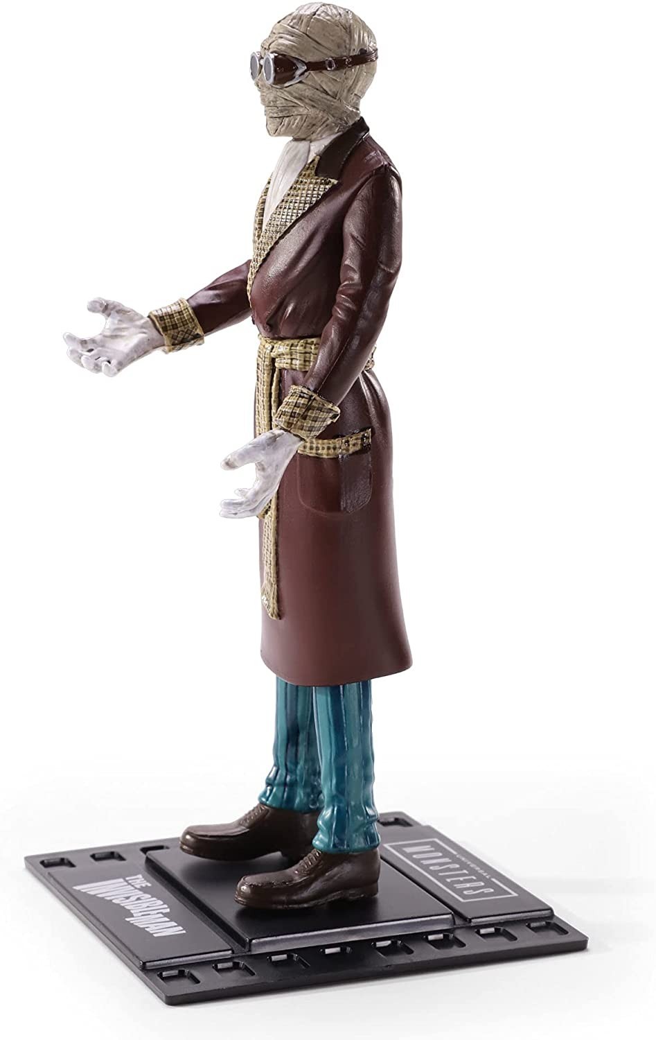 Bendyfigs, la línea de figuras flexibles de PVC de Noble Toys nos ofrece una colección de licencia oficial basada en los famosos Monstruos de la Universal. El Hombre Invisible fue interpretado con maestría por un terrorífico Claude Rains en la película en la que se inspira esta figura de unos 17 cms. Está esculpida y pintada con un detalle artesanal como el que se usó para realizar esta serie de películas de los años veinte, treinta y cuarenta. La peana que incluye tiene la forma de un fotograma de 35 milímetros. Una pequeña joya que cualquier cinéfilo pondrá en un sitio especial de su colección.