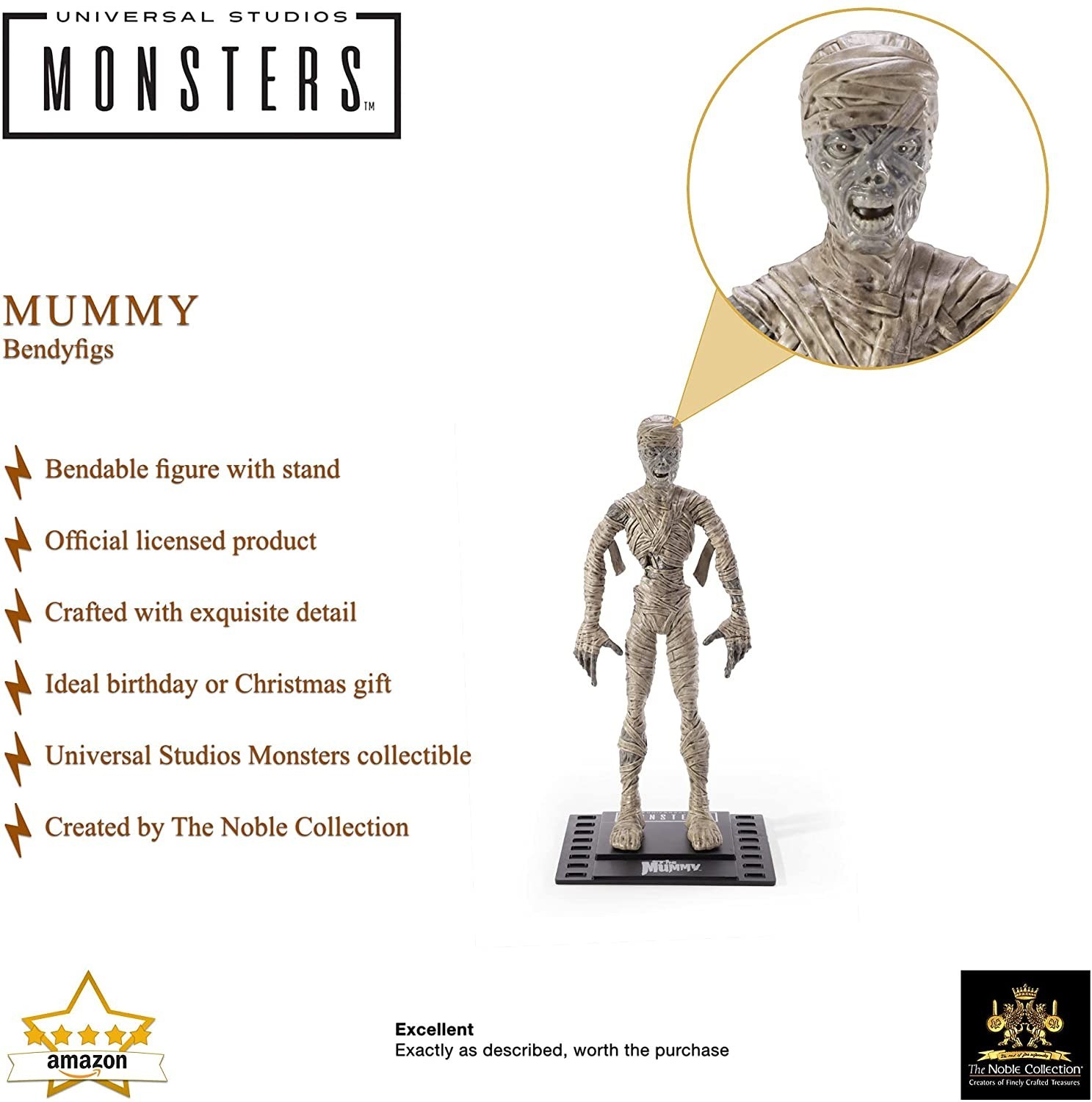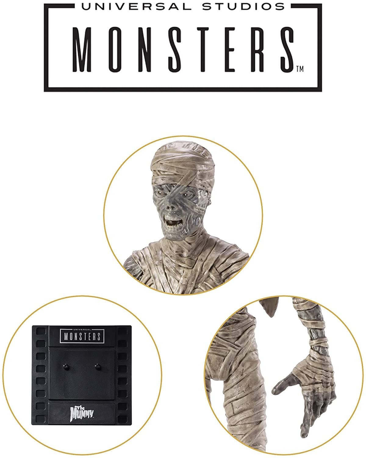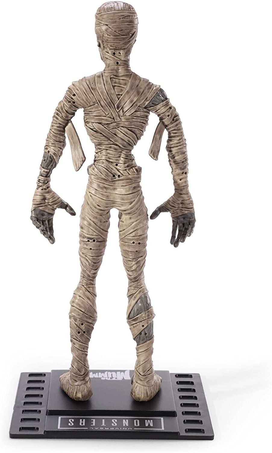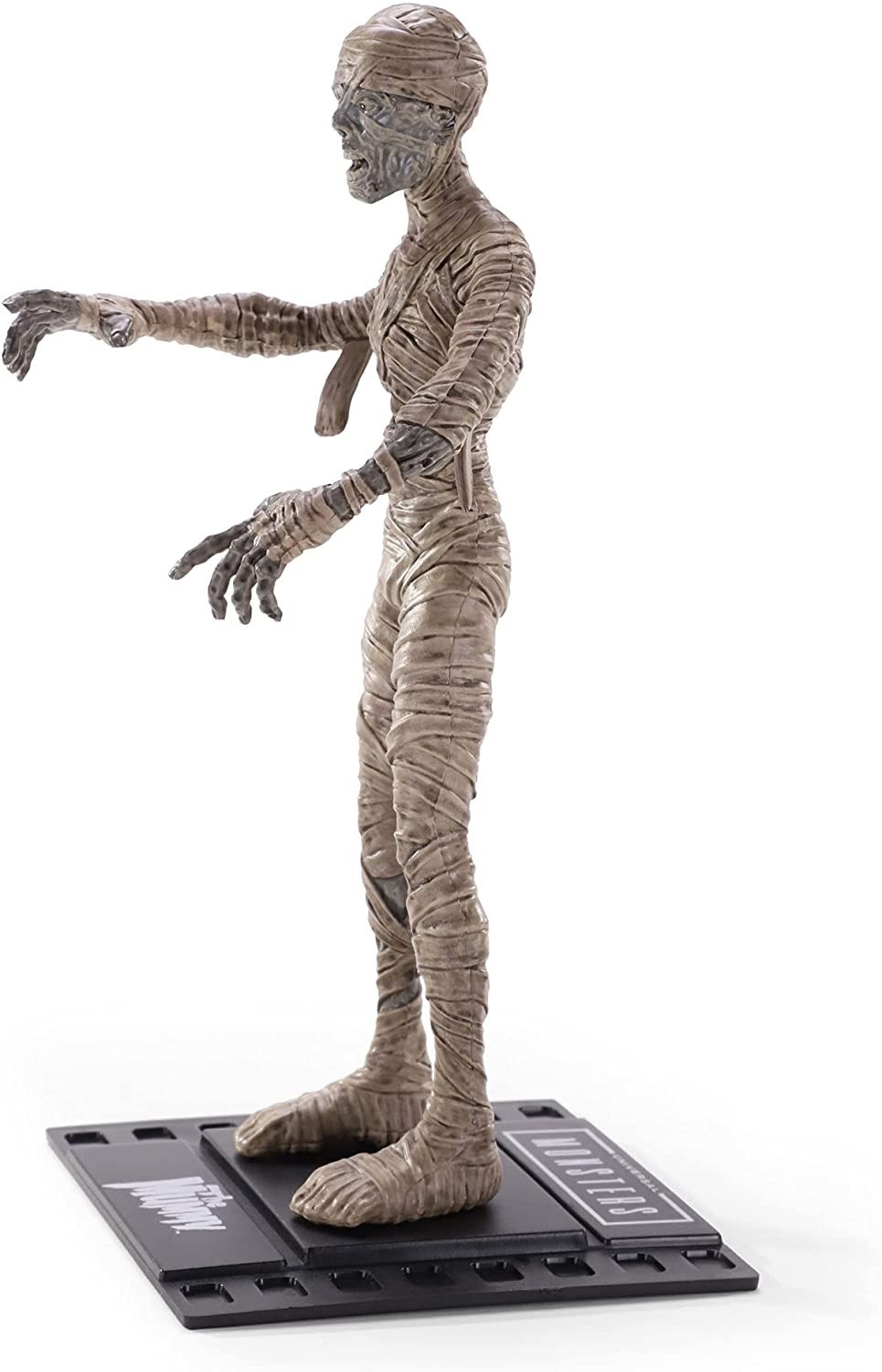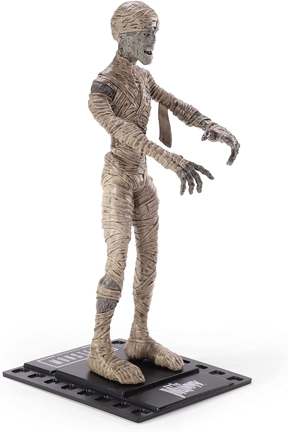 Noble Toys ha creado una serie de figuras basadas en los míticos monstruos de la Universal para su línea Bendyfigs. Esta figura flexible de la Momia que pertenece a dicha colección de estos personajes clásicos. Mide 19 cms e incluye una base con forma de fotograma de 35 mm para que coloques encima a esta Momia que tiene un rediseño ligeramente más cartoon que la de la película protagonizada por Boris Karloff.