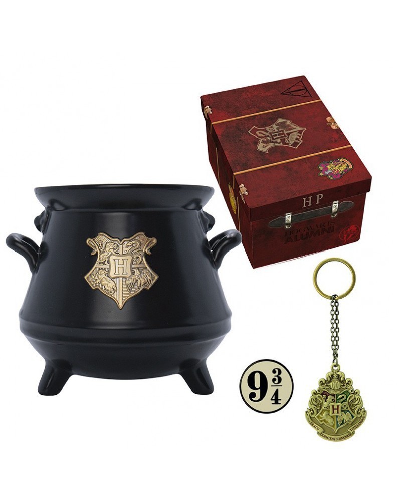 Te traemos una espectacular caja regalo de la saga más mágica del cine y de la literatura de los últimos años. La marca Abystyle ha creado este pack para los fans más fieles de Harry Potter y del Colegio Hogwarts de Magia y Hechicería. Incluye una taza de cerámica de 400 mls de capacidad y con un diseño que le hace asemejarse a un caldero, un pin con el símbolo del famoso Andén 9 y ¾, y un llavero del escudo de Hogwarts. Tres elegantes artículos que vienen en una caja temática que imita un baúl de viaje en el que podrás guardar lo que quieras después de sacar tus nuevos regalos mágicos. La taza no es apta para su uso en lavavajillas ni microondas.