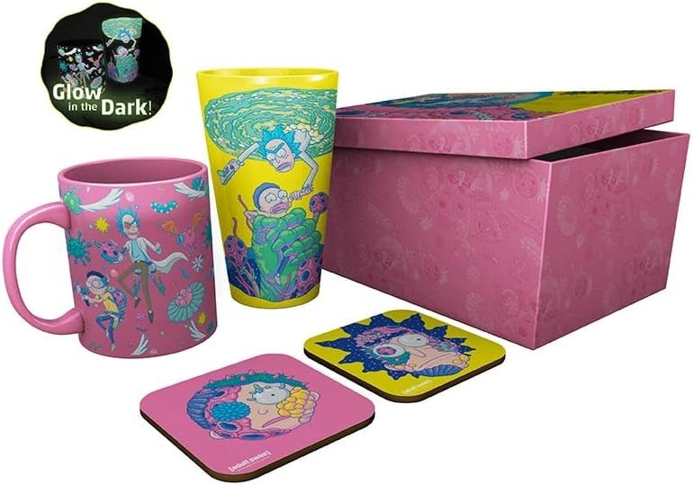 Rick & Morty van de una aventura tras otra, y si tú también quieres seguirles el ritmo loco que llevan, necesitarás coger energía. Abystyle nos trae desde la dimensión Trufcoltiana una espectacular caja de regalo con dos posavasos, una taza de cerámica de 285 mls y un vaso de cristal de 500 mls de capacidad. ¡El vaso y la taza están decorados con divertidos dibujos de Rick & Morty que brillan en la oscuridad! Es un producto oficial de Adult Swim que no es apto para lavavajillas ni microondas. Destapa la caja de desayuno más loca del multiverso.