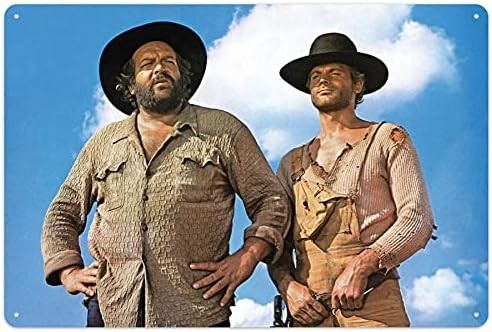 Libertad, melena al viento y el retumbar del galope de los caballos en el suelo del desierto. Eso es lo que te sugerirá esta placa metálica cada vez que la veas. Los dos héroes del cine mamporrero, Bud Spencer & Terence Hill, posan con su desaliñado vestuario de supervivientes del salvaje oeste en esta pieza ideal para coleccionistas. Las dos figuras en relieve se recortan contra un imponente cielo azul Tiene agujeritos en las cuatro esquinas para colgarlo en tu pared cinéfila, y tiene unas medidas de 30 x 20 cms.