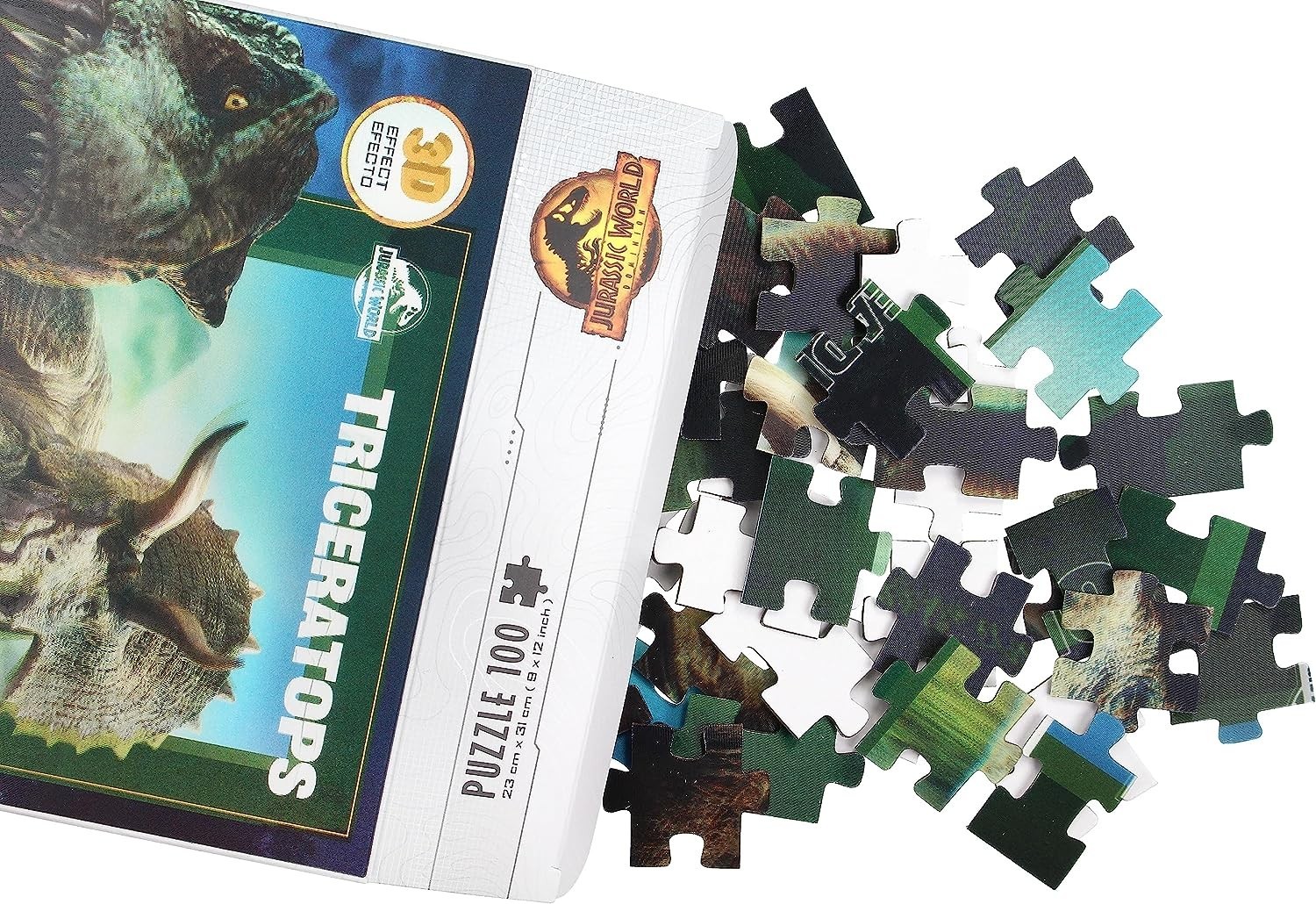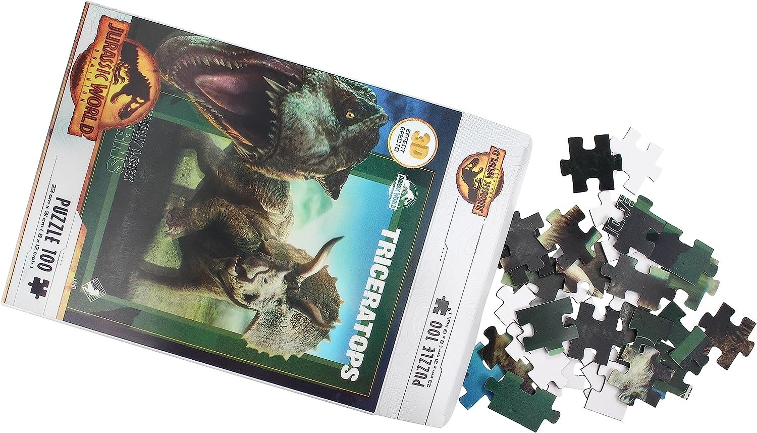 Si te gustan los puzles, te traemos uno inspirado en una de las sagas más famosas del cine de aventuras y ciencia ficción: Jurassic Park, y más en concreto en Jurassic World. Creado por SD Toys, este puzle de 100 piezas es un regalazo espectacular para los fans de la saga creada por Steven Spielberg, Michael Crichton y Colin Trevorrow. Está compuesto por 100 piezas con un efecto lenticular 3D con el que parece que un imponente Triceratops va a salir a darse un paseíto por tu casa. Una vez completado tendrá unas medidas de 23 x 31 cms.