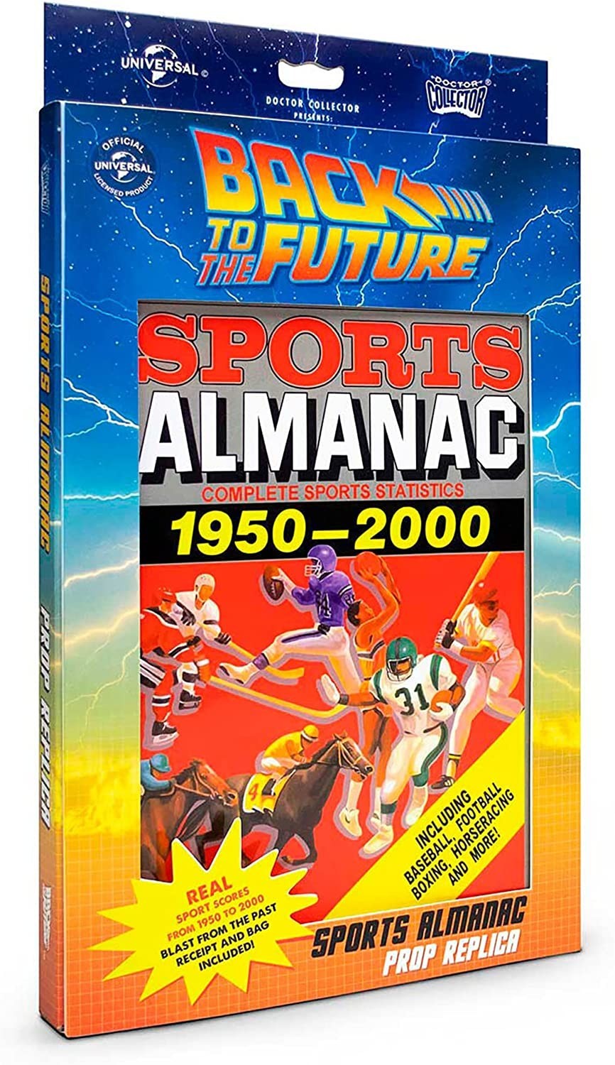¡Ni el pasado ni el futuro se te resistirán con el auténtico almanaque deportivo de Regreso al Futuro! La prestigiosa marca Doctor Collector, especializada en impresionantes réplicas de los objetos más icónicos del cine y la televisión nos trae el sensacional almanaque que Marty McFly compró en el año 2015 en su viaje al futuro desde 1985. Si eres fan de la saga creada por Bob Gale y Bob Zemeckis y producida por Steven Spielberg sabrás que el villano Biff logró hacer toda su fortuna cuando recogió este preciado artículo de una papelera… Y ahora la réplica más exacta de este almanaque puede ser tuya, y atento porque no solo viene con TODAS las páginas del de la película, sino que también incluye el auténtico recibo de la tienda Blast From The Past en la que Marty lo compra y la bolsa plateada en la que lo transporta. ¡Una maravilla de artículo con licencia oficial de Universal Pictures salida directamente desde el futuro!
