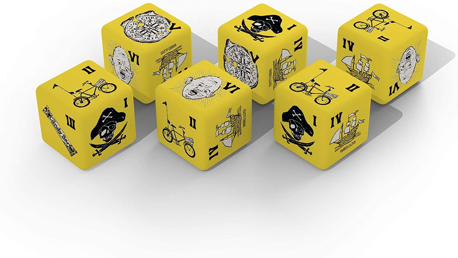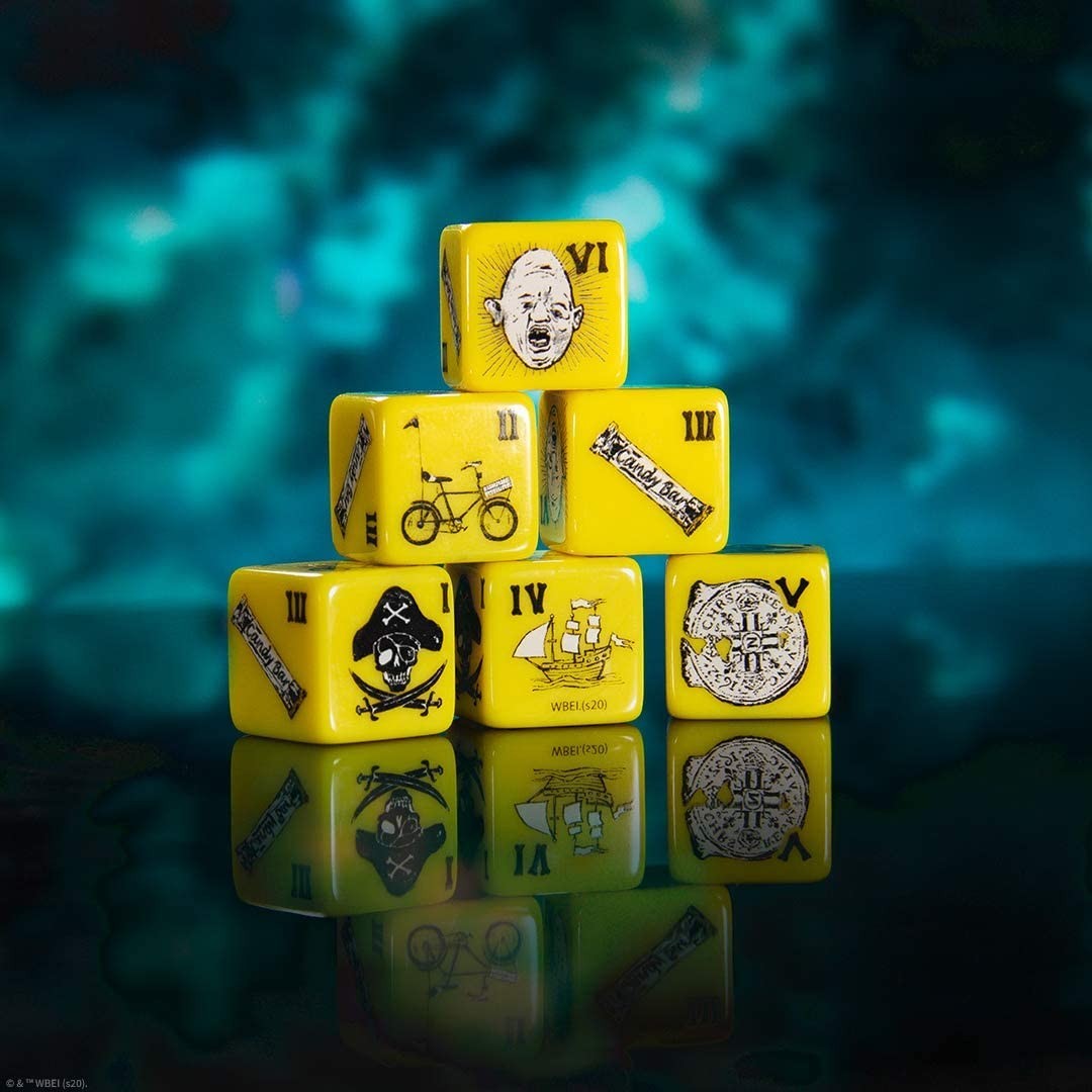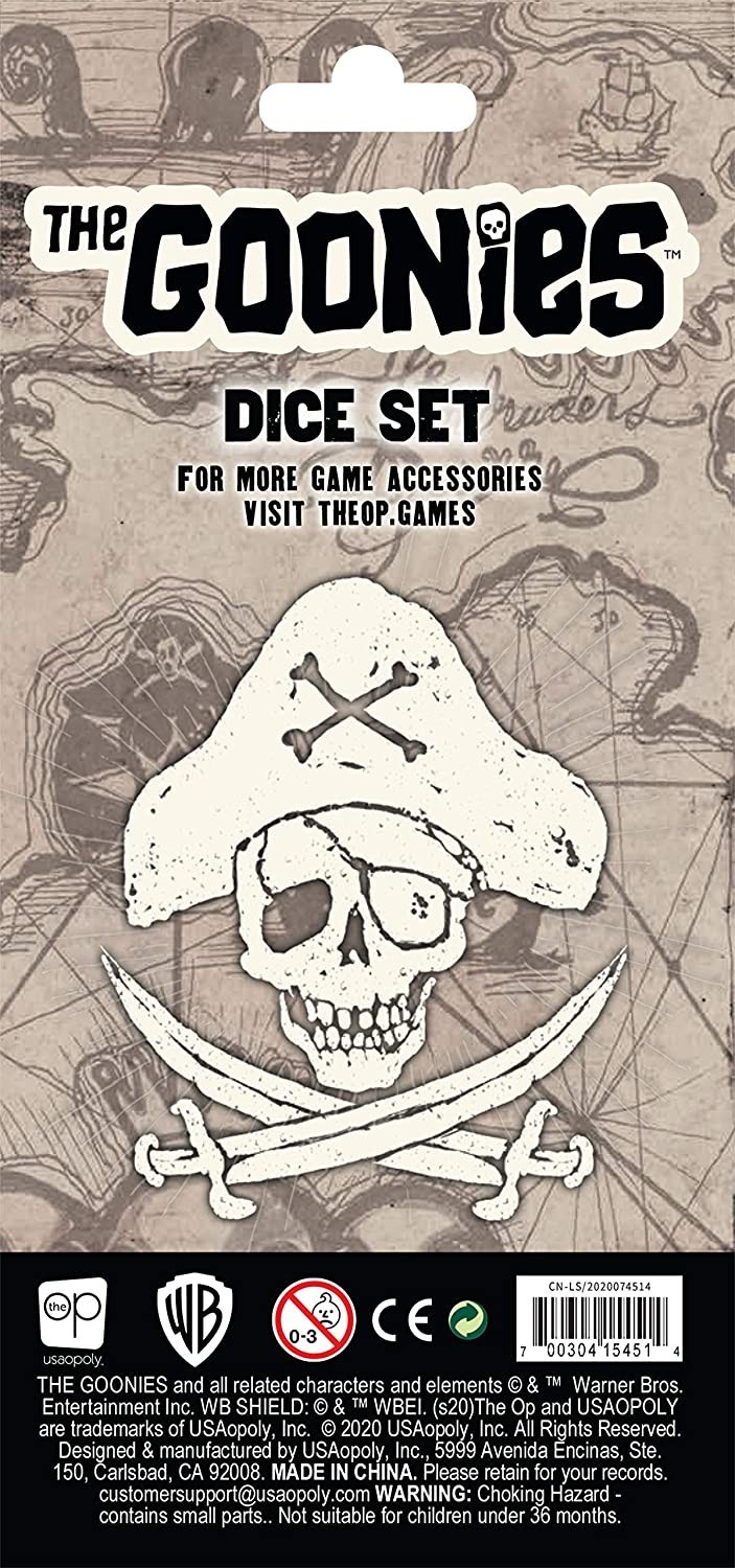 ¡Atención grumetes! The OP Accesories nos trae un set de seis dados inspirados en una de las películas ochenteras más queridas: "Los Goonies". Dirigida por Richard Donner y producida por Steven Spielberg, esta cinta fue el salto de la fama de varias futuras estrellas de cine como Josh Brolin o Sean Astin. Los seis dados son amarillos y tienen ilustraciones de color negro de varios elementos característicos de la película como el barco pirata, la brújula, la bicicleta... Viene en un blíster que imita el codiciado mapa que cae en poder de Los Goonies y que los llevará hasta un legendario tesoro pirata... ¡Los fans de los ochenta y de los juegos de rol están de enhorabuena!