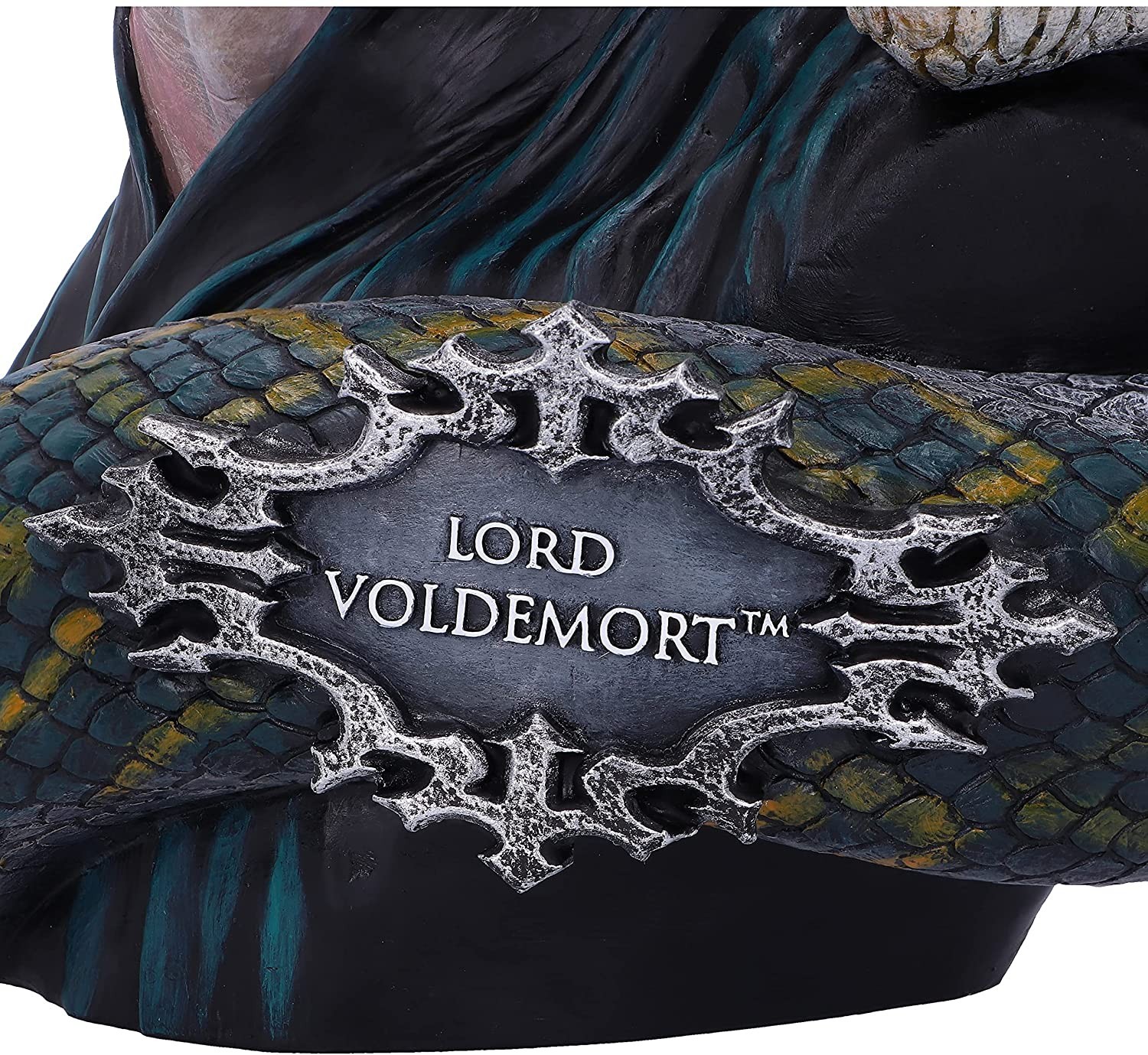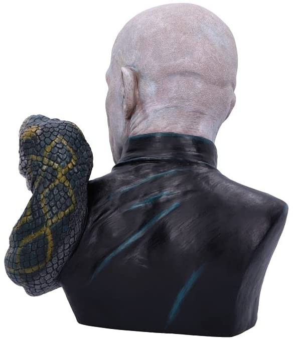 Si quieres un busto que te sorprenda, te maraville y te aterrorice a partes iguales, este tesoro que ha creado Nemesis Now es para ti. Mide unos 30 cms de altura y 27 cms de ancho. Lord Voldemort cobra vida en esta impresionante pieza hecha de resina y pintada a mano. Pero no solo ha sido pintada, sino que parece que ha sido hechizada para cobrar vida. Sus ojos, arrugas, imperfecciones de la piel y forma del cuello de la túnica son TAN realistas que te asustará. No hemos visto nunca una expresión tan lograda y unos ojos que transmitan tanta vida en una estatua. Además, alrededor del pecho del señor oscuro viene enroscada la cabeza y el cuello de su fiel serpiente Nagini. También tiene una placa incorporada con el nombre del personaje para que si alguien ha estado metido bajo una piedra los últimos 20 años sepa a quién pertenece este escalofriante busto. Absolutamente impresionante.