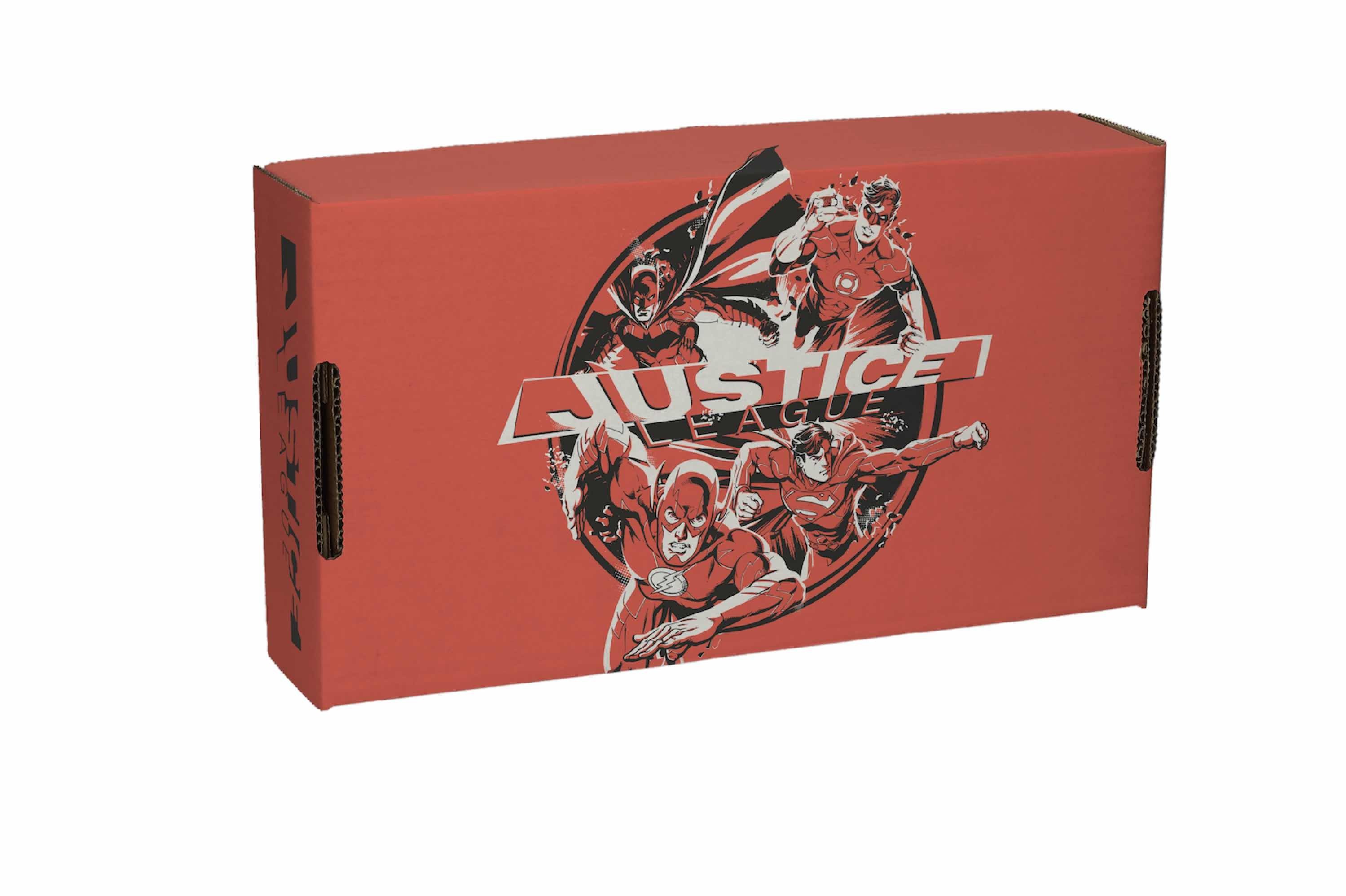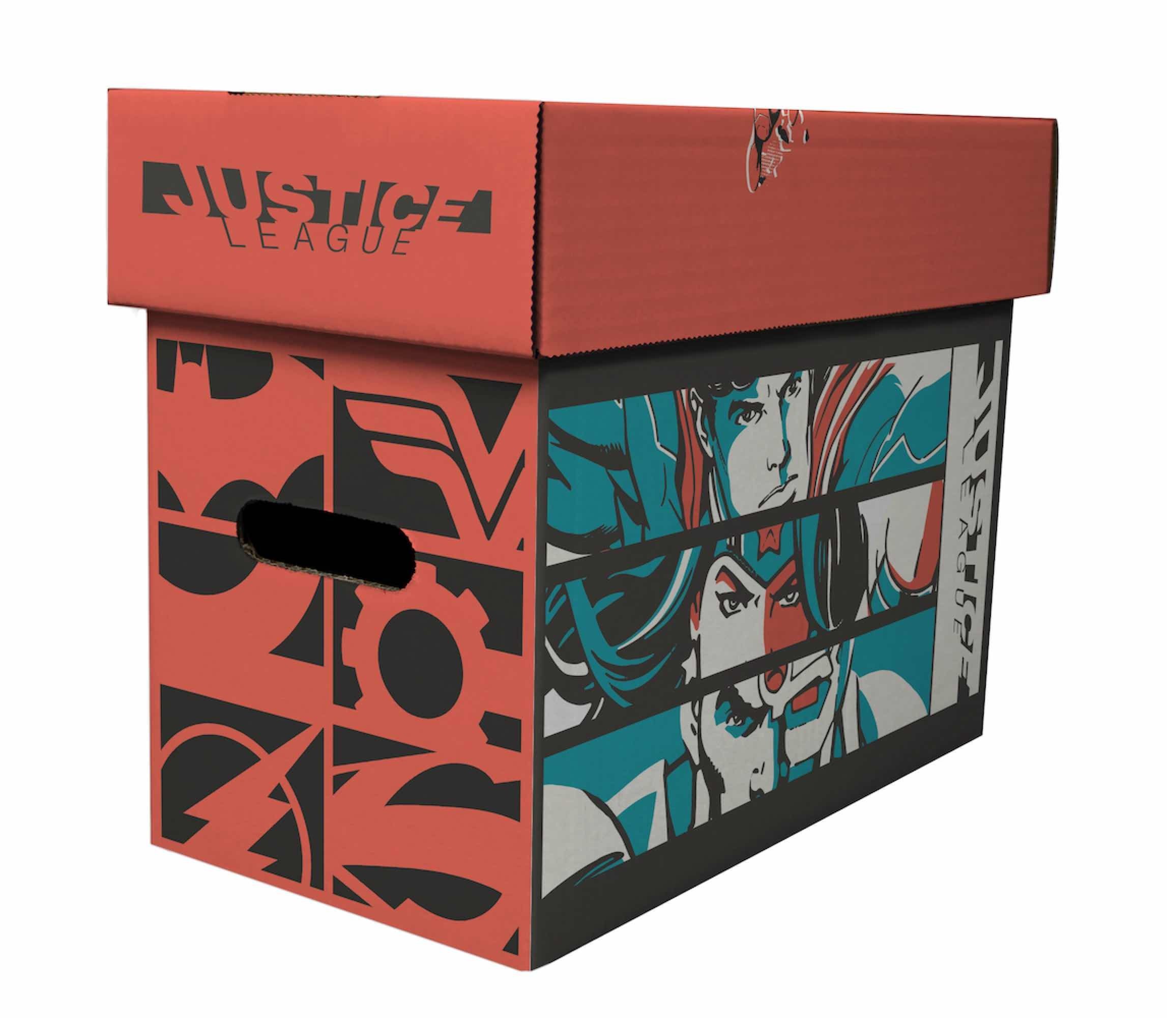 Magnífica y espectacular caja de SD Toys para guardar tus cómics favoritos de la editorial DC. Está decorada con una ilustración a todo color y de gran calidad de la Liga de la Justicia con su logo y los símbolos de los héroes. Es una caja que hay que plegar que viene con tapa para proteger tus cómics del polvo y de la luz solar, además está libre de ácidos para ayudar aún más a su conservación. Viene en una bolsa de plástico protector y una vez montada tiene dos ranuras a los lados para meter los dedos y transportarla mejor.