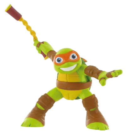 Minifigura de plástico de 9 cms de altura de Michelangelo, la tortuga ninja de antifaz naranja y que pelea con nunchakus. Nos le trae la marca Comansi y es ideal para decorar tartas de cumpleaños (o pizzas) de fans de los ninjas más famosos de Nueva York.