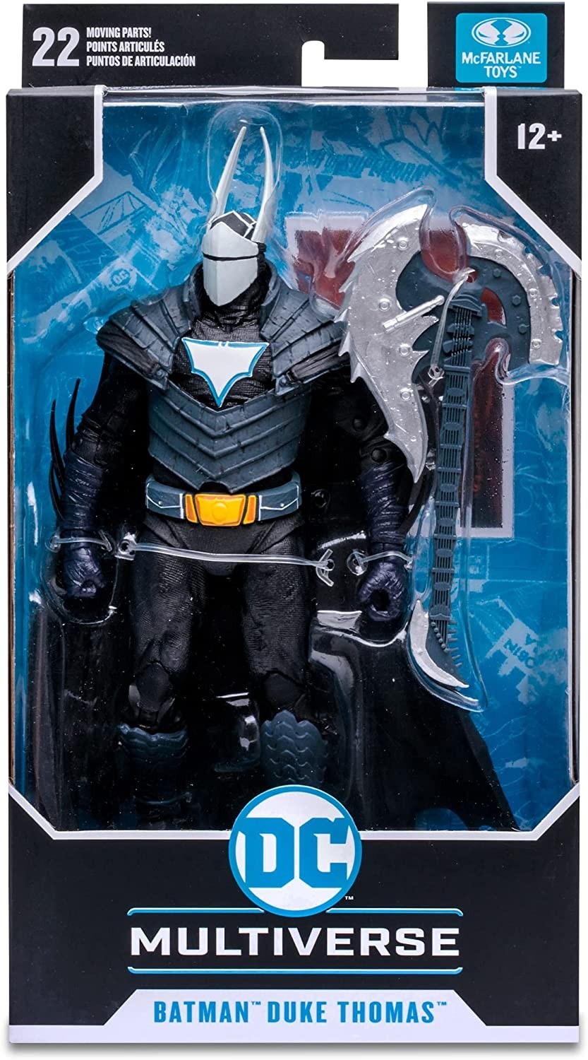 Duke Thomas, el Caballero Final, es un imponente Batman del Multiverso del Hombre Murciélago. Su figura de acción de McFarlane Toys mide 18 cms y recrea a la perfección al peculiar personaje. Le acompaña una peana de exposición, un hacha de su Tierra y una carta con una ilustración y una breve bio del personaje. La caja negra y azul de la línea DC Multiverse de McFarlane viene con ventana transparente para que puedas ver al personaje incluso antes de sacarlo de la misma. Batman tiene hasta 22 articulaciones y está hecho de PVC de gran calidad.
