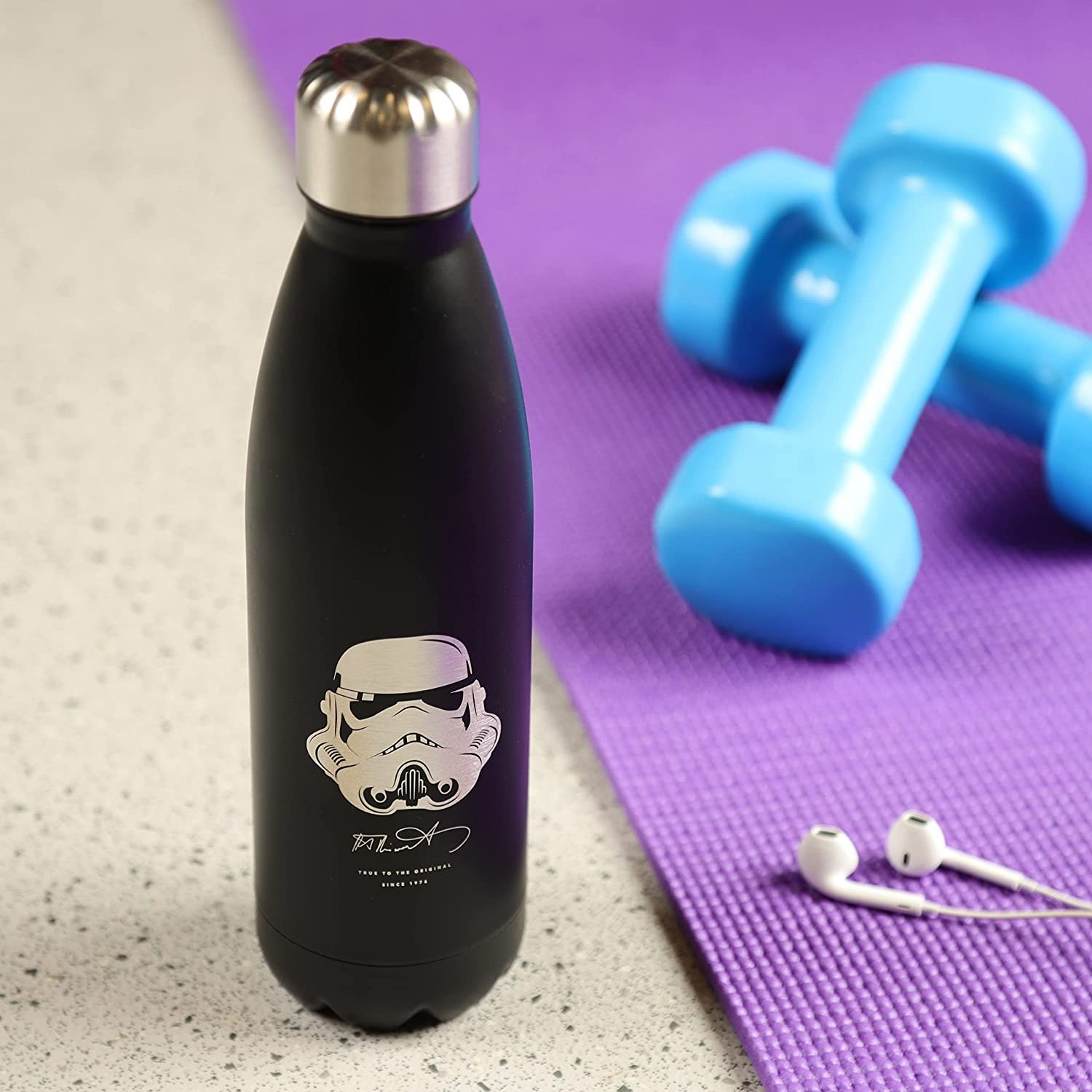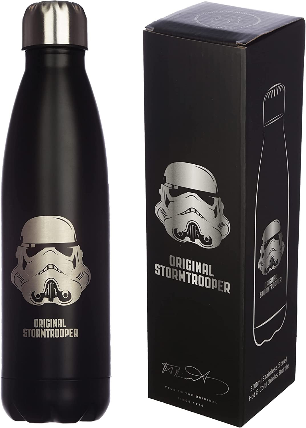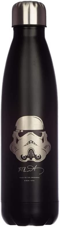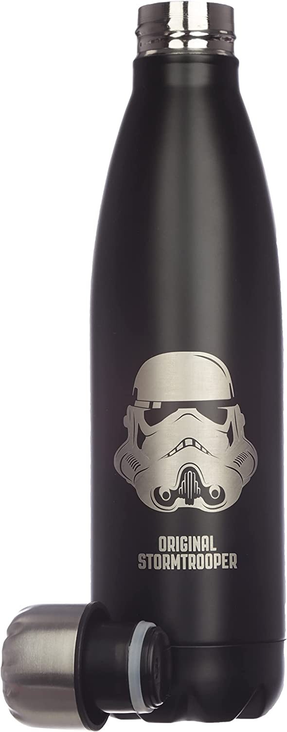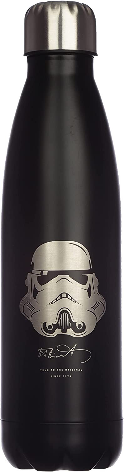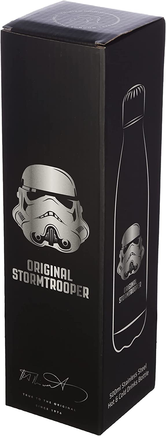 La marca Puckator ha viajado hasta una ‘Galaxia Muy Muy Lejana’ para traerte una exclusiva botella térmica de acero inoxidable de licencia oficial Original Stormtrooper. Es una preciosa botella de color negro con una ilustración del casco de un soldado de asalto y la firma de autenticidad debajo. Tiene tapón enroscable y mantendrá tus bebidas frías hasta 24 horas y calientes hasta 12 horas. Tiene una capacidad aproximada de 500 mls. Viene en una elegante caja negra también con ilustraciones de los cascos de estos soldados famosos en la galaxia entera. El regalo perfecto para un fan de Star Wars que necesite una botella para las próximas excursiones a planetas lejanos…
