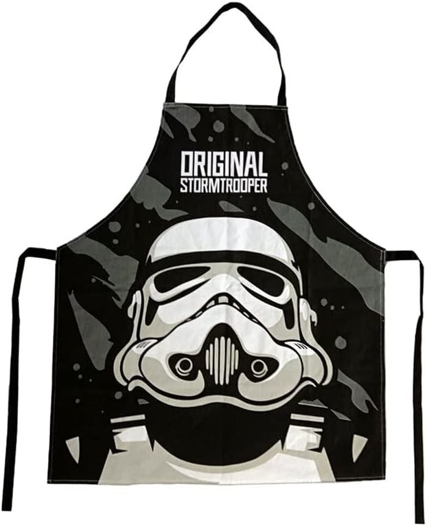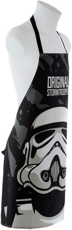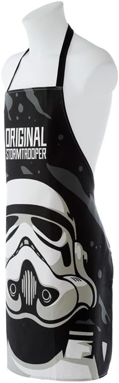 La marca Original Stromtrooper, de Shepperton Studios es única en el sentido de que parte de los diseños y moldes originales usados en la trilogía original de Star Wars. Podríamos decir que es la marca ‘Gran Reserva’ en lo que se refiere a artículos que tienen que ver con los Stromtroopers (Soldados Imperiales o Soldados de Asalto). Creado por Puckator y con licencia oficial de Original Stormtrooper, este delantal será el complemento ideal para todos esos fans del universo creado por George Lucas que vayan a ponerse delante de los fogones. Está hecho de polialgodón y es de color negro con un dibujo de un primer plano de un Stormtrooper en pose orgullosa. Prepara tus mejores barbacoas imperiales con tu nuevo delantal y verás como ni el mismísimo Emperador Palpatine se resiste a tus dotes culinarias. Tiene una doble cinta trasera para atárselo como es debido y no tropezar por los pasillos de la Estrella de la Muerte.