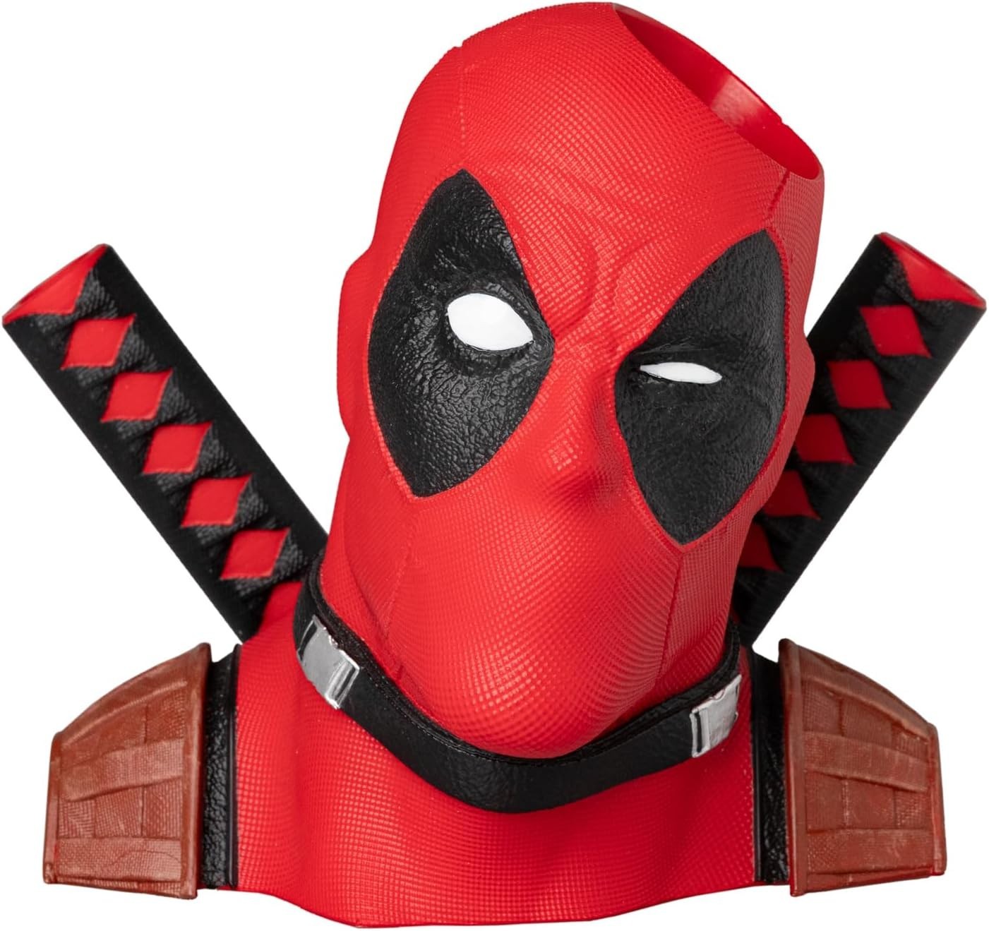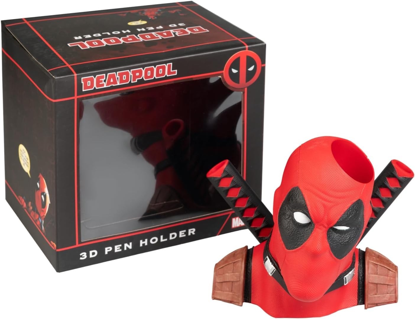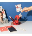 Este mercenario puede ser un bocazas, pero cuando hay que ayudar a hacer el trabajo o los deberes, es el primero con quién puedes contar. Con unas medidas de 18 x 16 x 16 cms, este bote o lapicero de Deadpool, es nada más y nada menos que una representación en 3D de los hombros y la cabeza del personaje de Marvel, o, en otras palabras, es un busto. Y en él podrás meter tus lápices y bolígrafos para que te los sujete. ¿En él? Si, pero no en ese agujero que piensas, sino en la cabeza y en el mango de su… katana. El relieve que tiene en el traje es tan fiel al relieve auténtico como lo es él a las chimichangas y a Vanesa. Está hecho de resina y ABS, y es un artículo de licencia oficial Marvel que ha creado la marca Erik. Viene en una caja temática con ventana de exposición.