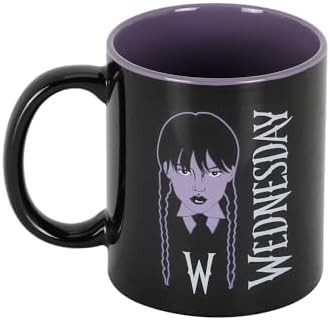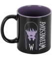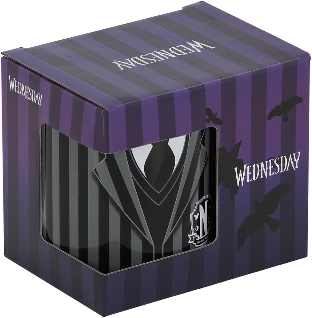 ¿Fan de Wednesday? Pues serás feliz con esta taza que está decorada con el uniforme que luce la protagonista en su serie de streaming. Tiene una capacidad de unos 380 mls, está hecha de cerámica, y tiene licencia oficial. Es una taza apta para lavavajillas y microondas, y es una creación de Karacter Mania. Viene en una caja temática morada con el logo de la serie. ¿Te apetece un desayuno gótico?