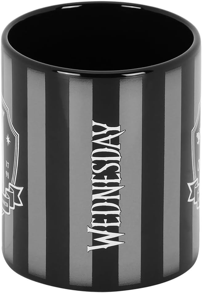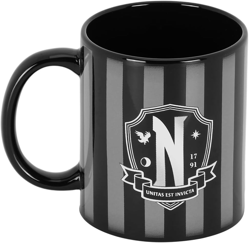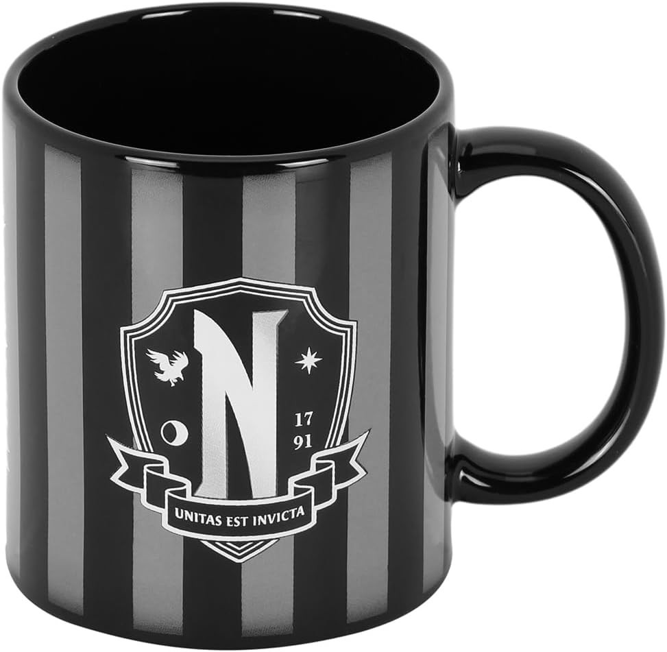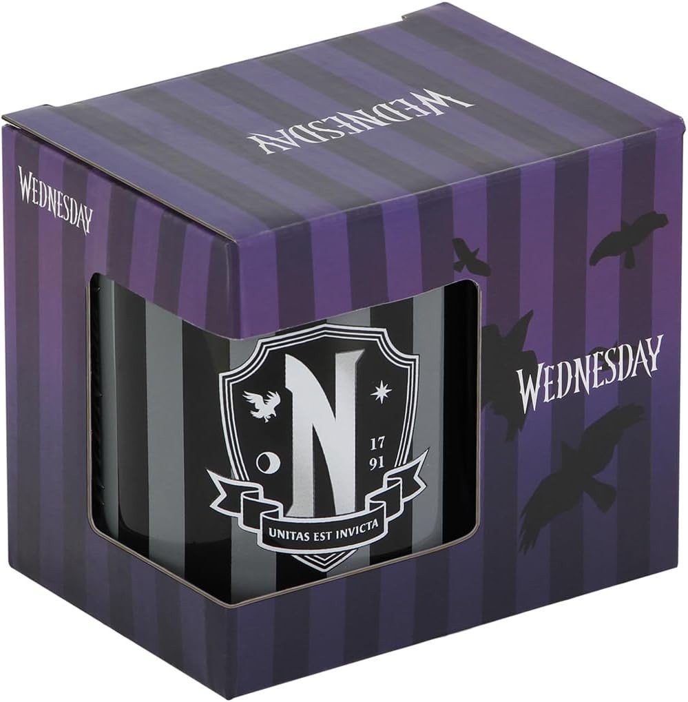 El logo del colegio al que va Wednesday Addams, es el protagonista absoluto de esta taza de Karacter Mania. Tiene una capacidad aproximada de 380 mls y esta hecha de cerámica. Podrás meterla al lavavajillas y al microondas, y viene dentro de una caja temática. ¿Te hace un desayuno gótico?