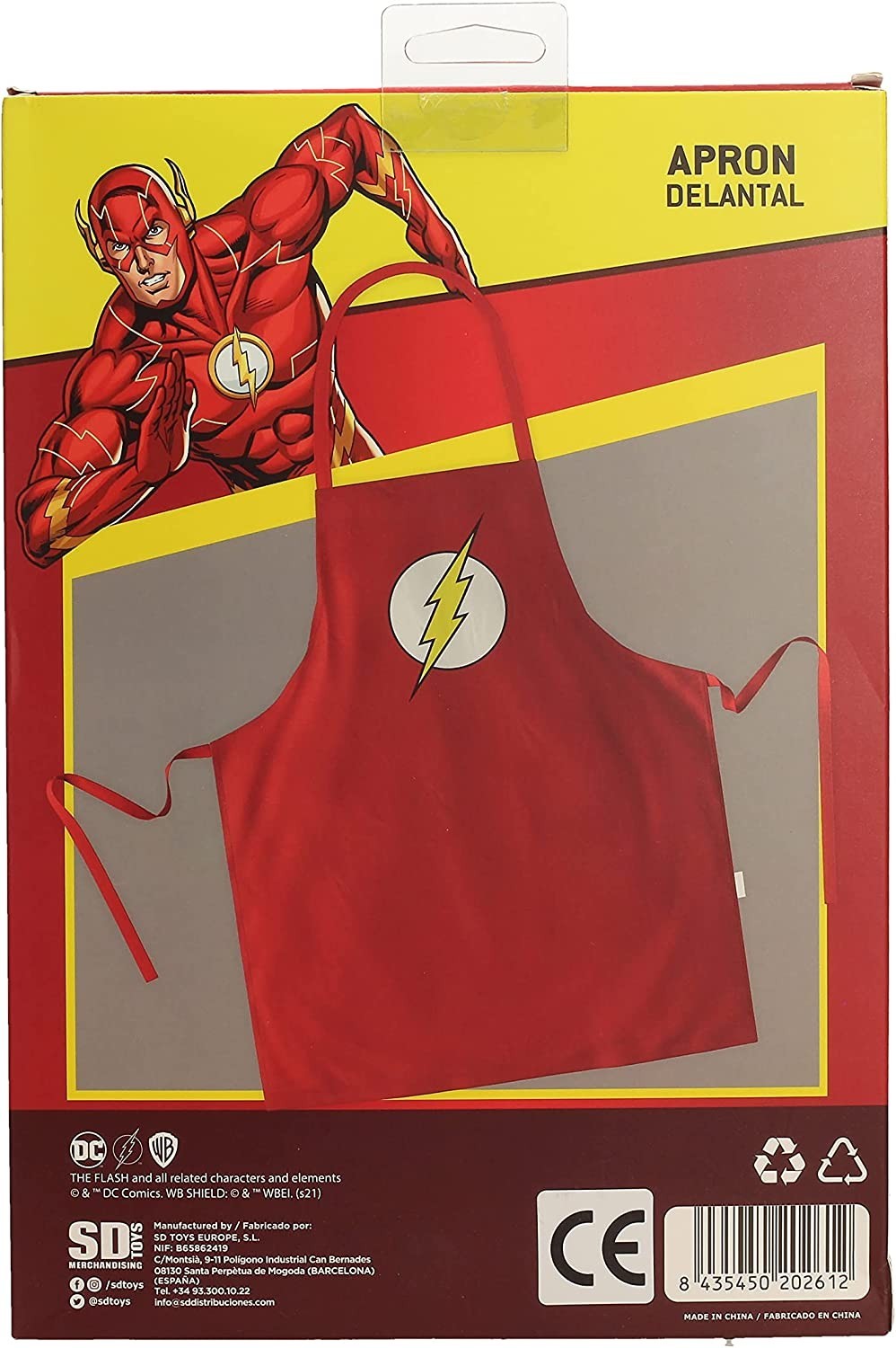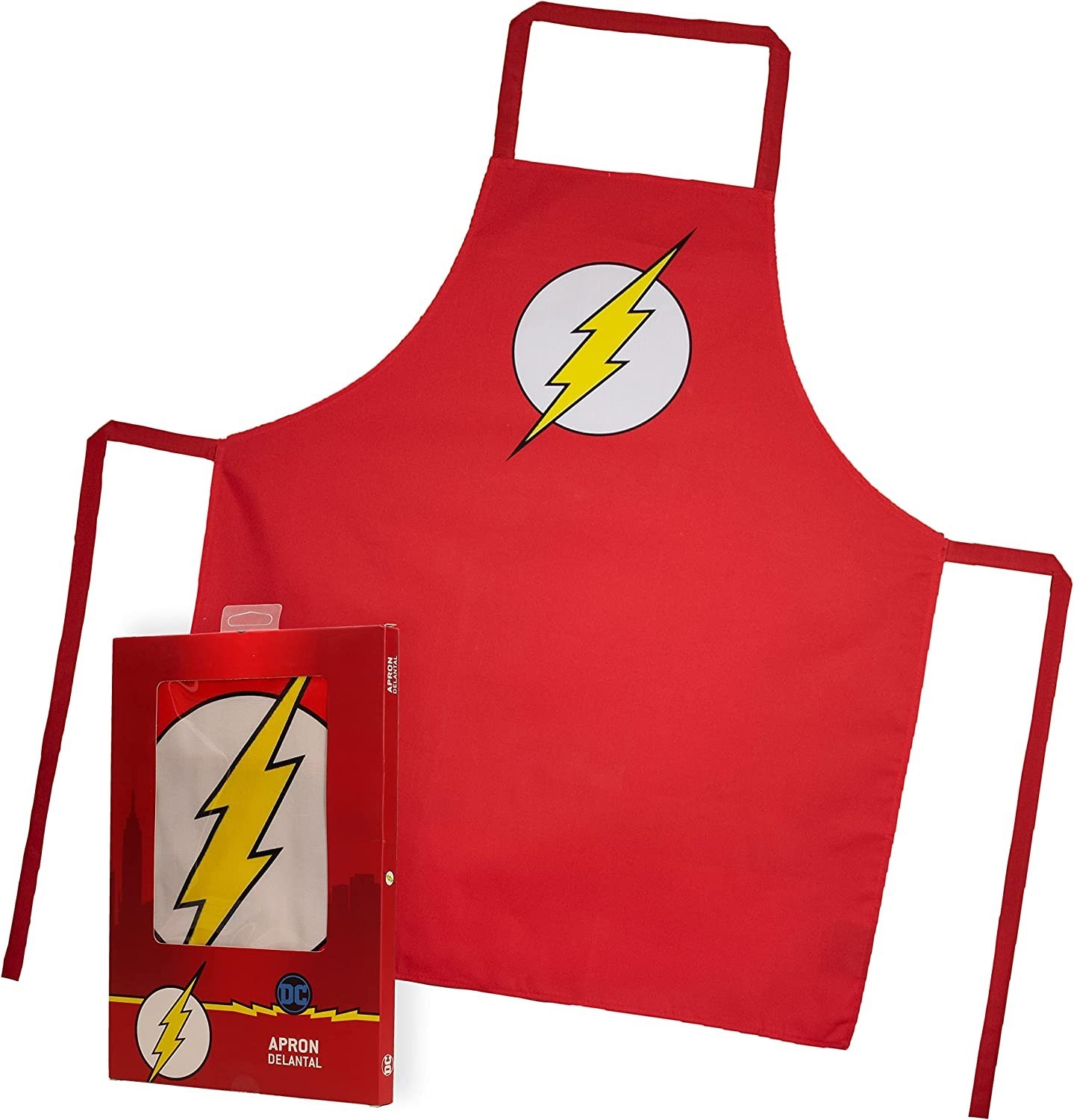 ¡Prepárate para ser mas rápido que un rayo cocinando tus platos favoritos con el delantal de Flash que nos trae SD Toys! Es un producto oficial de DC y Warner Bros y es de color rojo con el famoso rayo amarillo sobre círculo blanco que forma el símbolo de Flash, el superhéroe velocista de la Liga de la Justicia. Tiene dos tiras para poder atártelo haciendo un lazo y proteger tu uniforme de superhéroe con este colorido delantal. Está hecho de tela de gran calidad y viene en una caja temática con los colores característicos de Flash y una ilustración del personaje en la parte de atrás. ¡Corre a por él!