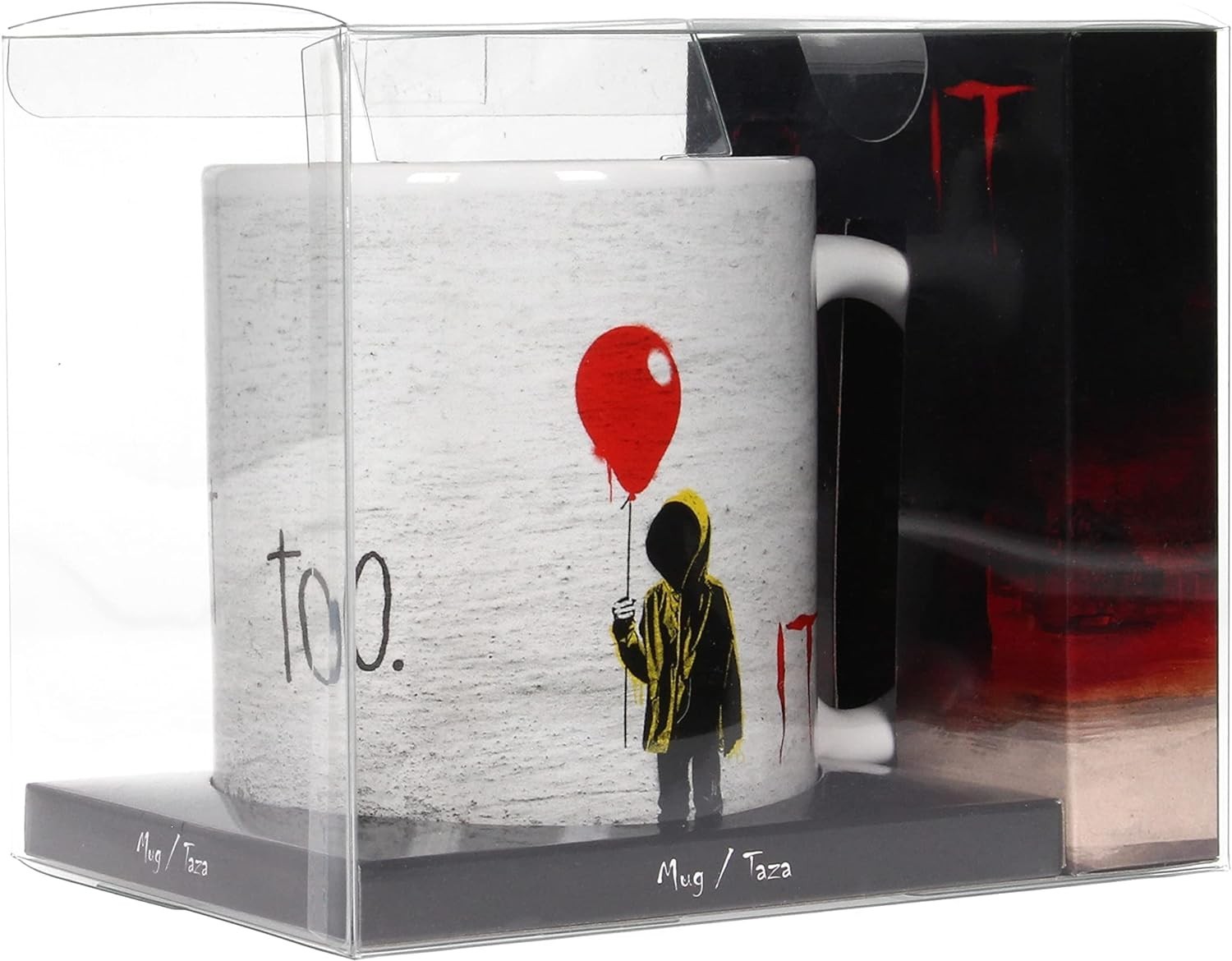 “You’ll float too” es la frase que viene escrita en esta taza basada en la película “It” de 2017 que adaptaba la novela de Stephen King de mismo nombre. Una ilustración de Georgie con un globo rojo acompaña también la frase. Es una taza de SD Toys de licencia oficial de Warner Bros que está hecha de cerámica y tiene una capacidad de 320 mls.