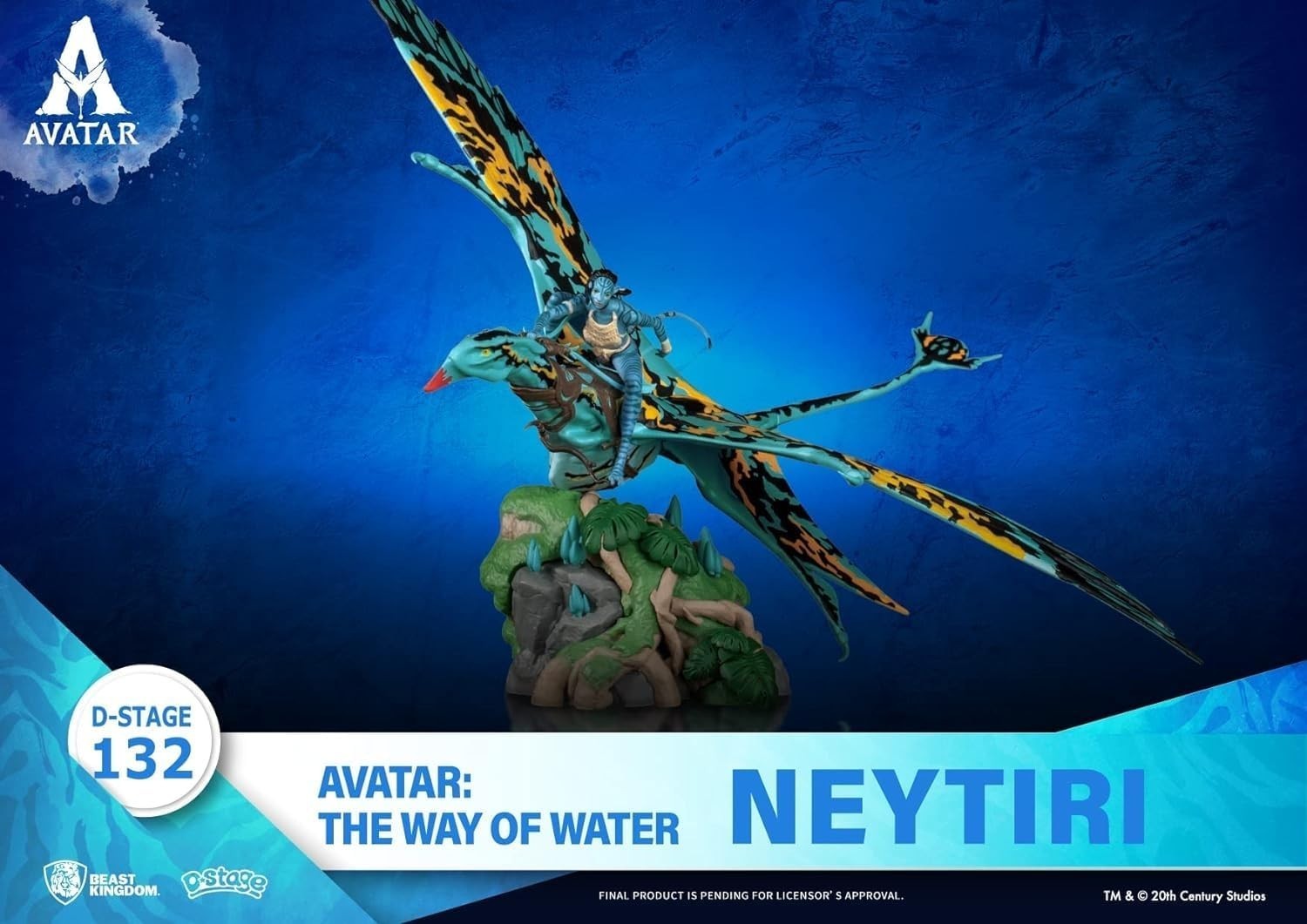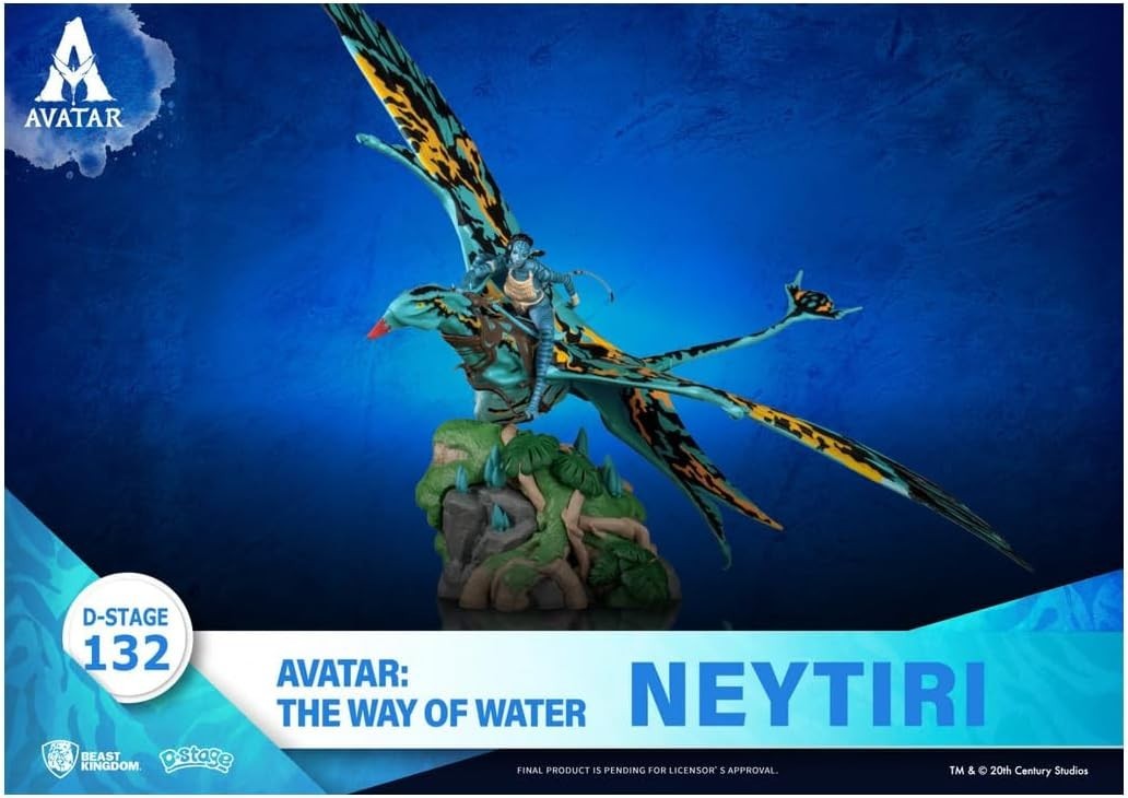 Neytiri y su banshee sobrevuelan las pacíficas y majestuosas montañas flotantes de Pandora. Esta figura de 15 cms, es en realidad un diorama que recupera toda la magia de la segunda entrega de la saga de Avatar, creada por el visionario James Cameron. Viene en una caja protectora y con ventana de exposición. Está hecha de PVC y el banshee se eleva sobre unas rocas con vegetación de las montañas de Pandora. Es un artículo de licencia oficial que ha creado la marca Beast Kingdom para la colección D Stage.
