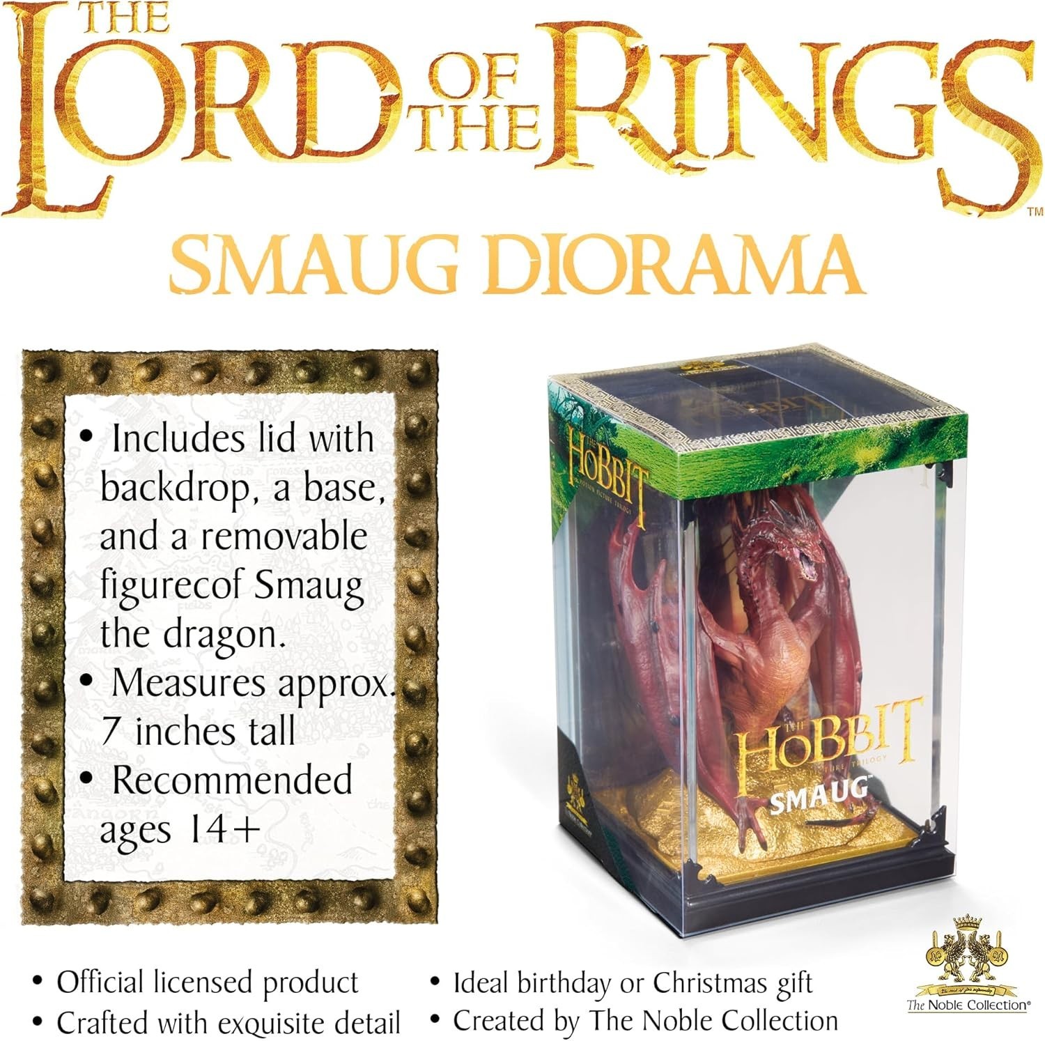 ¡Despierta la majestuosidad del dragón más temido de la Tierra Media con la figura diorama de 16 cms de Smaug! Inspirada en la trilogía cinematográfica de El Hobbit, esta impresionante pieza captura toda la ferocidad y grandeza del legendario dragón sobre su inigualable tesoro. Esculpida en PVC de alta calidad, la figura muestra a Smaug en todo su esplendor, con cada una de sus escamas detalladas con precisión, sus alas desplegadas y su mirada penetrante que parece arder con fuego interno. Bajo sus garras se extiende un suelo meticulosamente esculpido, recreando el vasto mar de monedas y joyas que componen su tesoro en Erebor. Cada moneda y cada gema reflejan el brillo del oro y la codicia que definió su reinado sobre la Montaña Solitaria. Presentada en una elegante caja acrílica transparente, esta figura es ideal para resaltar cada detalle desde cualquier ángulo, convirtiéndola en una pieza de exhibición tan impresionante como el propio Smaug. Perfecta para coleccionistas y fanáticos de la Tierra Media, esta figura no es solo un objeto decorativo, sino una ventana al mundo épico de El Hobbit, donde la avaricia y el poder se entrelazan en la leyenda de uno de los dragones más icónicos de la fantasía. ¡Hazte con esta joya y deja que el fuego de Smaug ilumine tu colección!
