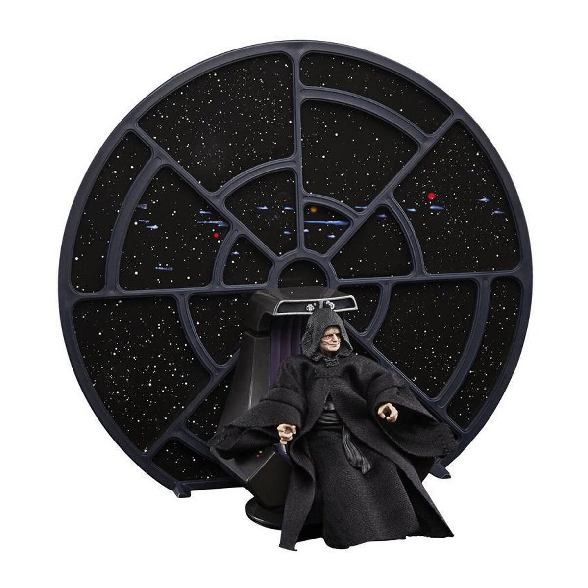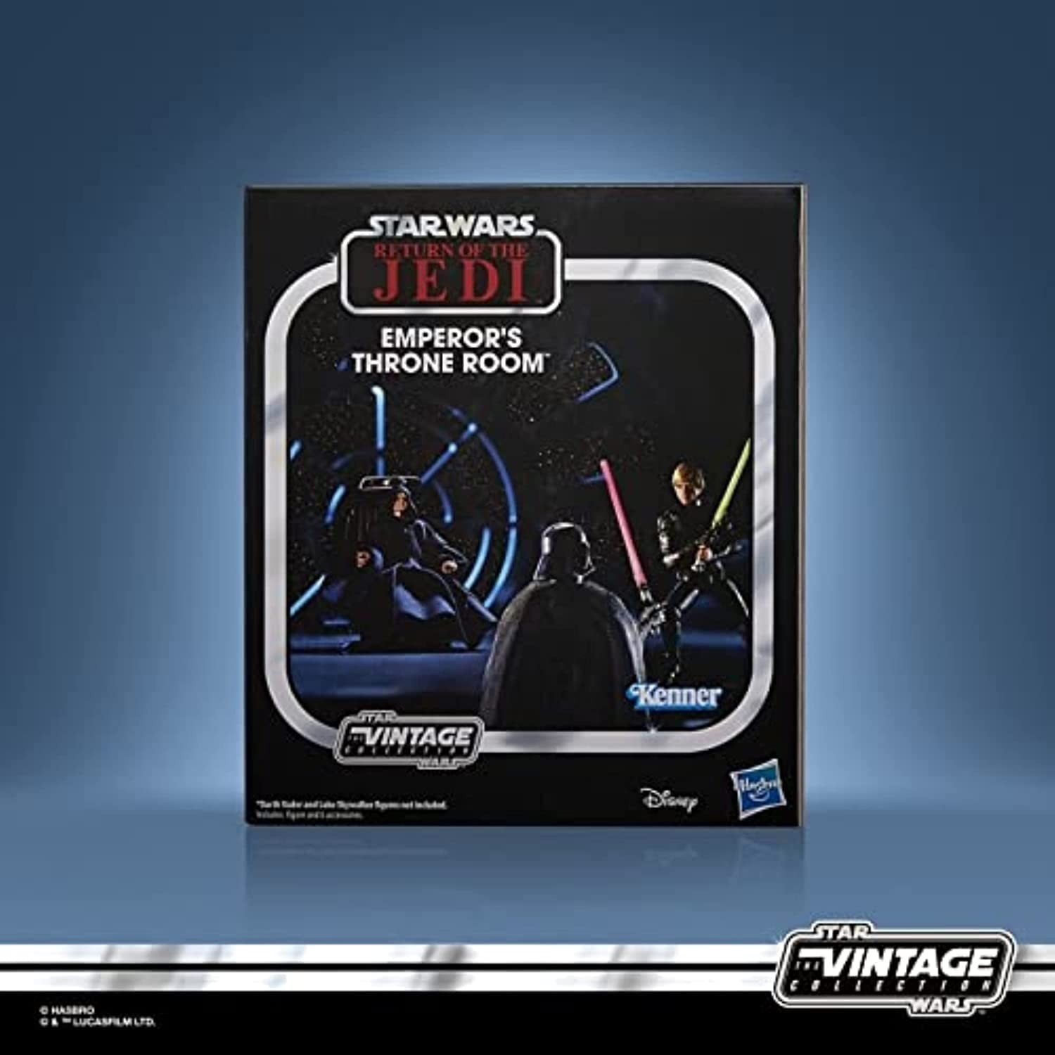 Producto de licencia oficial que te trae la marca Hasbro/Kenner. Esta maravilla de figura articulada del Emperador Palpatine incluye diorama del salón del trono que incluye el mismísimo trono y varios accesorios como bastón y rayos de energía Sith. Está basado en el decorado del clímax de la película "El Retorno del Jedi", la tercera cinta de la trilogía original de Star Wars. Este terrorífico Palpatine de 9,5 cms es ideal para que le complementes con otras figuras articuladas de la Vintage Collection del universo Star Wars y Hasbro.