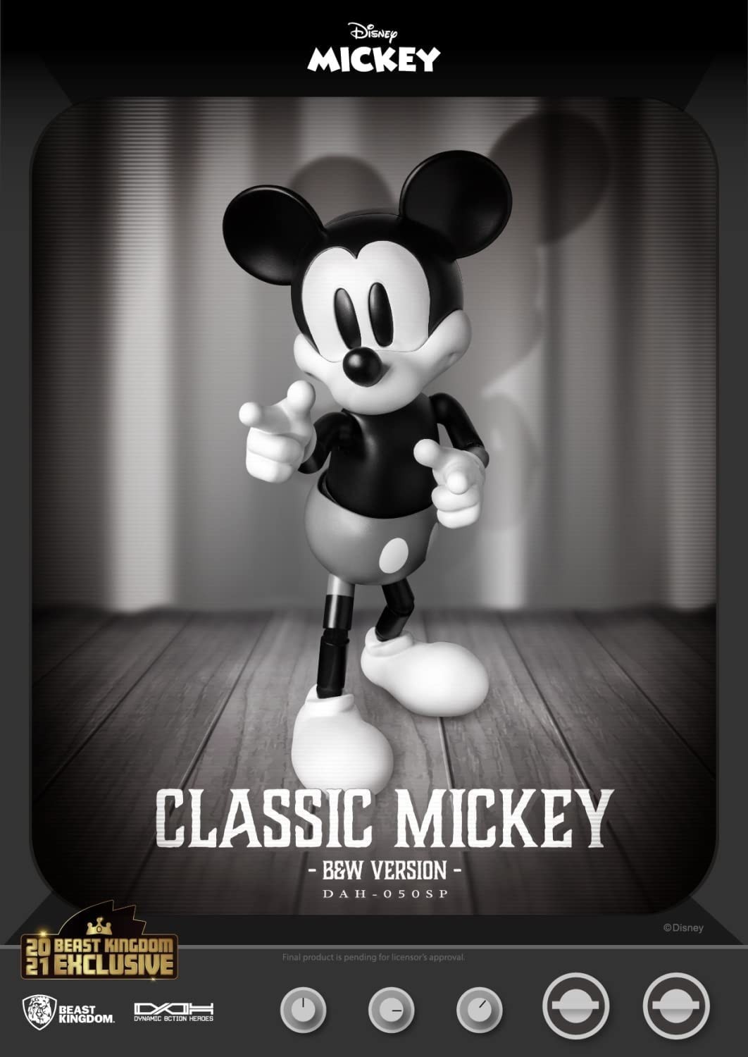 Te traemos una figura muy especial edición limitada de Mickey Mouse. Es una versión en blanco y negro del icónico personaje que cambió la historia del cine para siempre. Ha sido diseñada y creada por la marca Beast Kingdom, unos auténticos reyes a la hora de hacer figuras que transmiten alma y que tienen un acabado exquisito. Este Mickey Mouse en blanco y negro está inspirado en los primeros diseños del personaje. Incluye dos cabezas intercambiables, una más alegre y otra de estar a la expectativa. En la preciosa caja temática coleccionable vienen también tres pares de manos adicionales para que le des aún más variedad si quieres a Mickey. Mide unos 16,5 cms. Hazte con tu Mickey clásico antes de que se agoten y ten una pieza de historia del cine en tu casa.