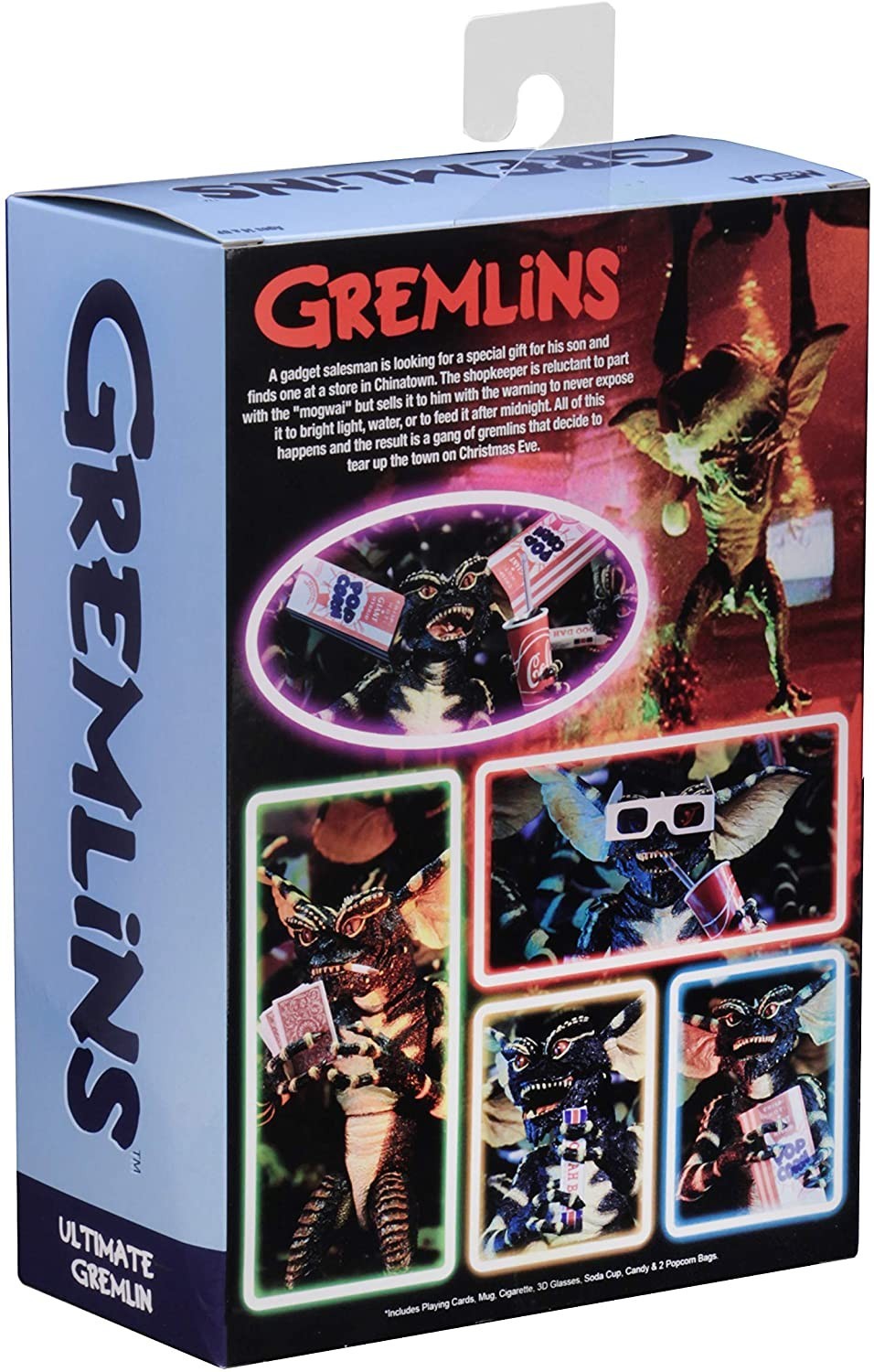 Neca es una de las marcas de referencia en el mundo de las réplicas y las figuras basadas en célebres franquicias del cine y la televisión. Esta vez te traen a uno de los alocados y malvados villanos Mogwai de la cinta de 1984 "Gremlins". El Ultimate Gremlin viene en una caja con tapa que se abre y revela la figura gracias a su ventana transparente. En la parte exterior de la tapa está la imagen que fue el teaser póster de la película dirigida por Joe Dante. Incluye divertidísimos y realistas accesorios como un cigarro, una jarra de cerveza, un vaso de bebida, dos bolsitas de snacks, una baraja de cartas y dos bolsas de palomitas para ponérselas en las orejotas igual que en la escena del cine en la película. Este Gremlin de 18 cms será la envidia de todos tus amigos fans de la icónica saga. ¡Hazte con el tuyo!