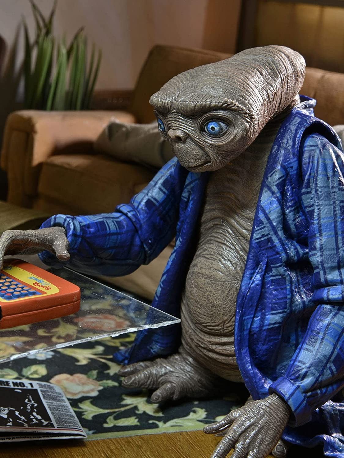 El adorable E.T. El Extraterrestre robó el corazón a los espectadores de todo el mundo en los años ochenta y su influencia sigue hoy más viva que nunca. El icónico extraterrestre salido de la imaginación de Steven Spielberg y Melissa Matheson llega a tu colección de figuras articuladas de cine con este E.T. de 12 cms. El Ultimate Telepathic E.T. representa al personaje tal y como salía en la escena en la que veía la TV en casa de Elliott, con su pizarra electrónica, dos pares de manos intercambiables (con dedo iluminado), teléfono rotatorio y mando a distancia incluidos. Lleva puesta la bata azul que lucía en este momento de la película en el que tenía la idea de construir un teléfono para llamar a su casa... Está hecho de PVC de gran calidad que ha sido pintado con extremo cuidado, desde sus arrugas hasta los expresivos ojos azules. Es una figura de licencia oficial de Amblin y Universal y viene en una espectacular caja temática coleccionable con tapa y ventana.