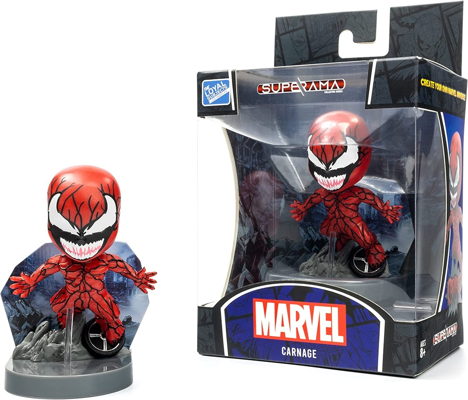 La marca The Loyal Subjects presenta otra figura de la línea Superama, y no es una cualquiera, es el mismísimo Carnage, llamado Matanza o Masacre en español. La línea a la que pertenece está formada por divertidas figuras miniatura (unos 10 cms de altura) que vienen sobre peanas temáticas y que incluyen un diorama acorde con el personaje que acompañan. Los dioramas son intercambiables, así que podrás coleccionarlas todas y crear tus propias variaciones. Viene en una ingeniosa caja temática con ventanas transparentes y una breve bio de Carnage en la parte trasera.