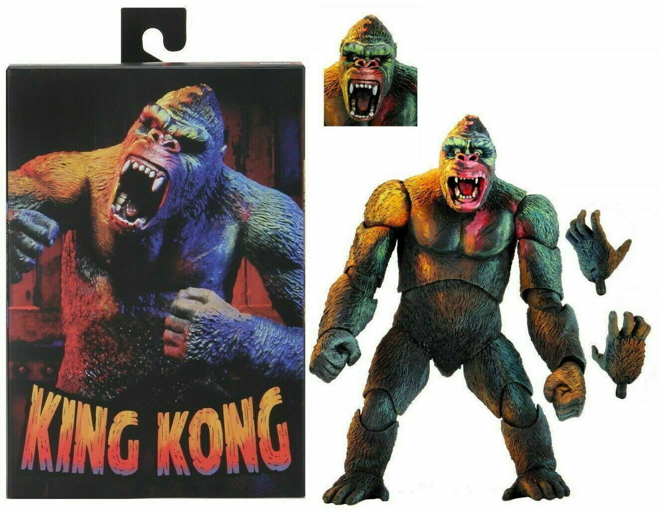 Figura articulada del único e inimitable King Kong. Esta figura de 18 cms aproximadamente está basado en el aspecto original del icónico gorila. Está esculpido por Kyle Windrix, que ha cuidado cada mechón de pelo y arruga de la cara. Jon Wardell se ha encargado del espectacular trabajo de pintura con algunos colores primarios inspirados en los carteles clásicos de la película de Merian Cooper que añaden pintorescos reflejos a King Kong, esto hace que sea una pieza a la que se le saca su mayor partido si está colocada en un diorama bien iluminado. Incluye dos manos intercambiables y una cabeza de recambio con una expresión aún más fiera. Disfruta con esta maravillosa y única pieza de la línea Reel Toys de Neca y lleva a uno de los personajes más queridos del cine a tu colección.