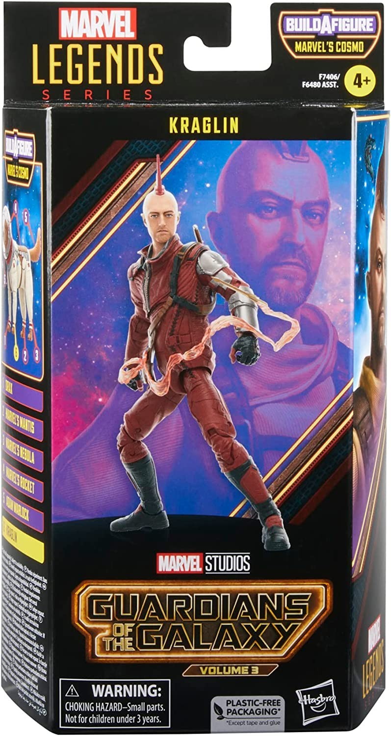 Kraglin se ganó poco a poco un hueco entre los Guardianes de la Galaxia ya desde el volumen uno. Ahora Hasbro nos trae dentro de la línea Marvel Legends la figura articulada de Kraglin basada en su aparición estelar en el volumen tres de la saga dirigida por James Gunn. Mide unos 15 cms e incluye una pieza de la perrita Cosmo para que la juntes con las demás de la colección Build-A-Figure. También viene con una navaja, parte del arsenal de Kraglin para las aventuras más peligrosas alrededor de la galaxia. Está hecho de PVC de gran calidad y viene con su aleta característica heredada de Yondu y su flecha telepáticamente controlada.