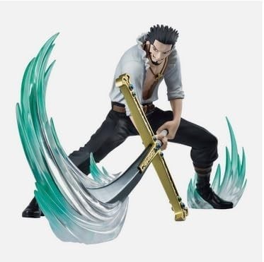 Dracule Mihawk, también llamado Ojos de Halcón, es (actualmente) el espadachín más fuerte del mundo. Este pirata de cuidada barba y enorme mandoble de guarda dorada, llega a la colección de figuras de los fans más apasionados de la serie de manga y anime One Piece, ¿eres tú uno de ellos? Este Dracule de unos 12 cms de altura está en plena descarga de un poderoso ataque con su espada. El efecto azul translúcido del ataque es el toque de dinamismo que hará que se distinga del resto de las figuras de tu colección. Es una creación de Bandai para la línea DXF Special. Celebra una de las series más queridas del mundo de la animación con este espectacular figurón.