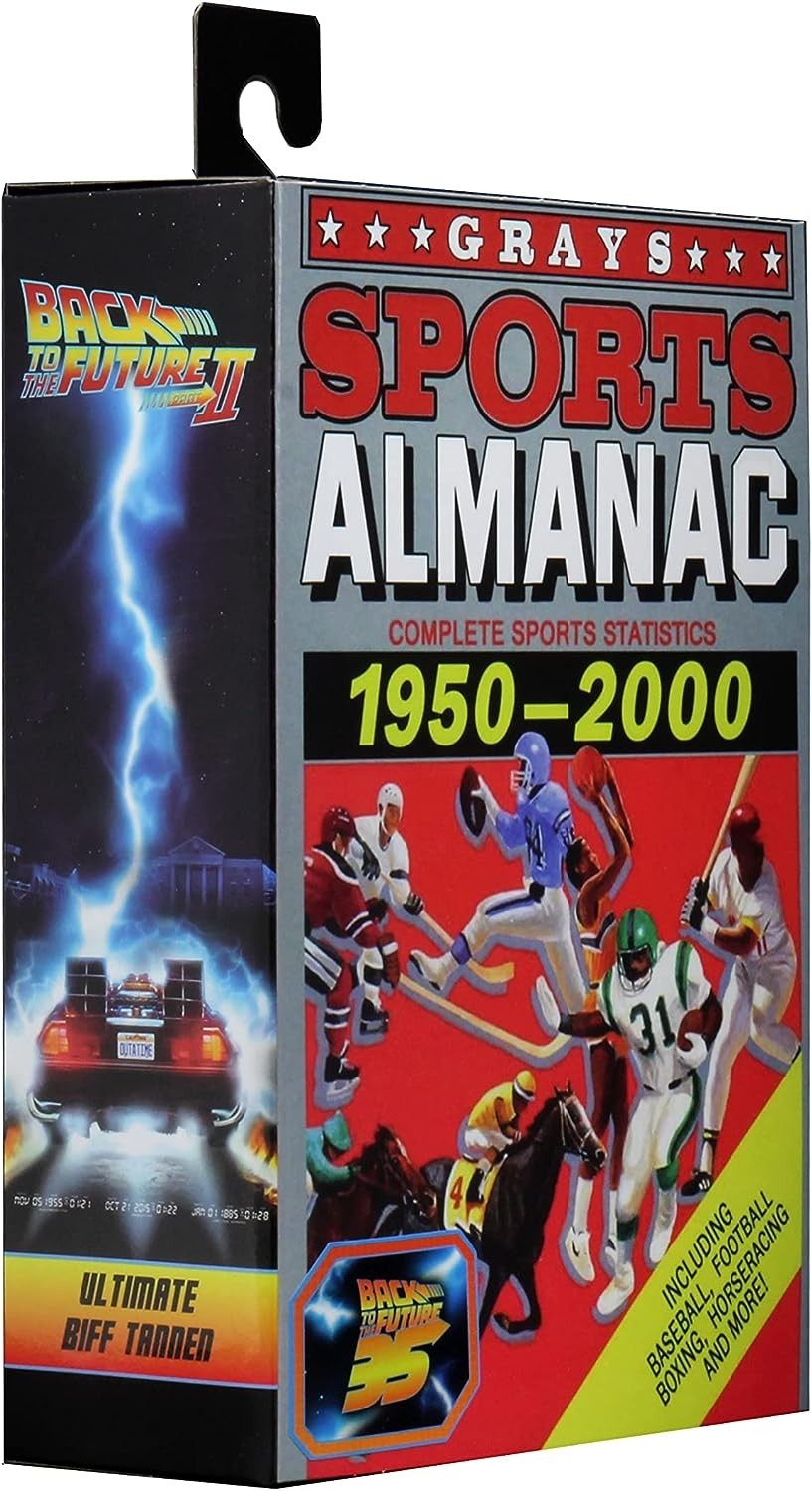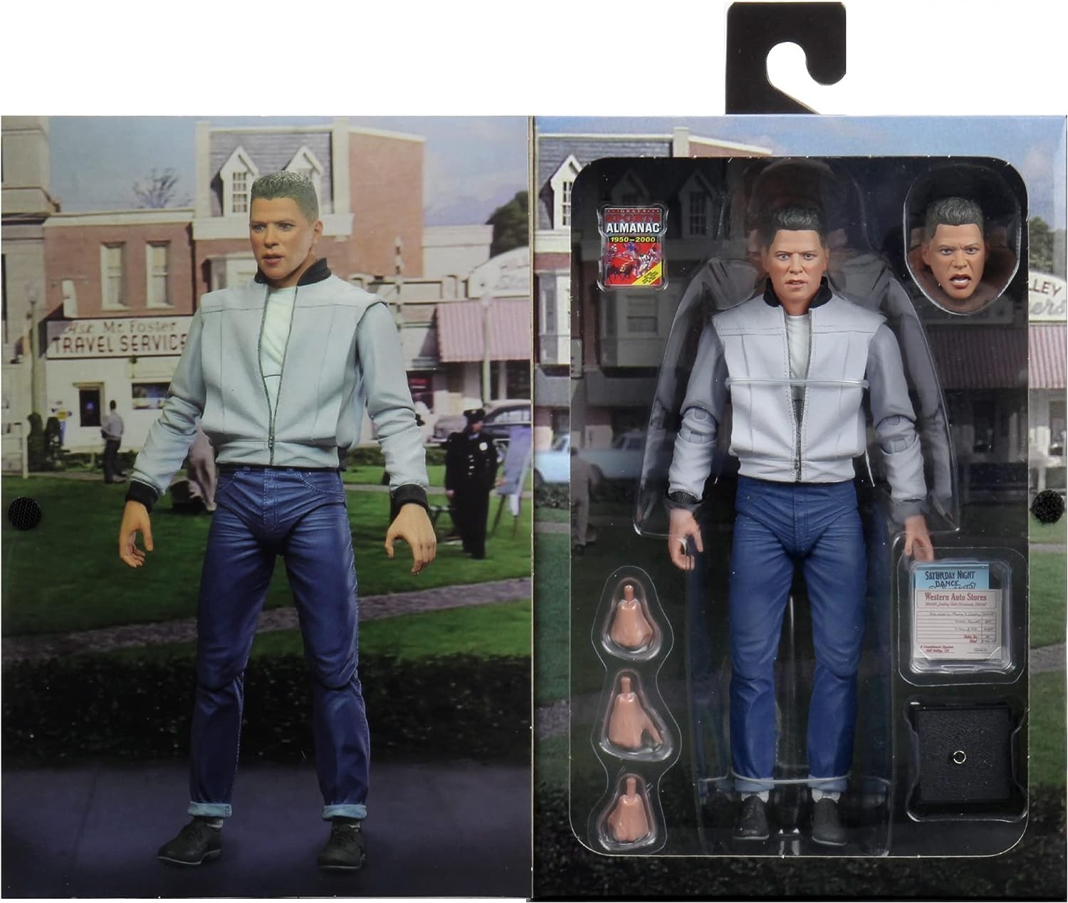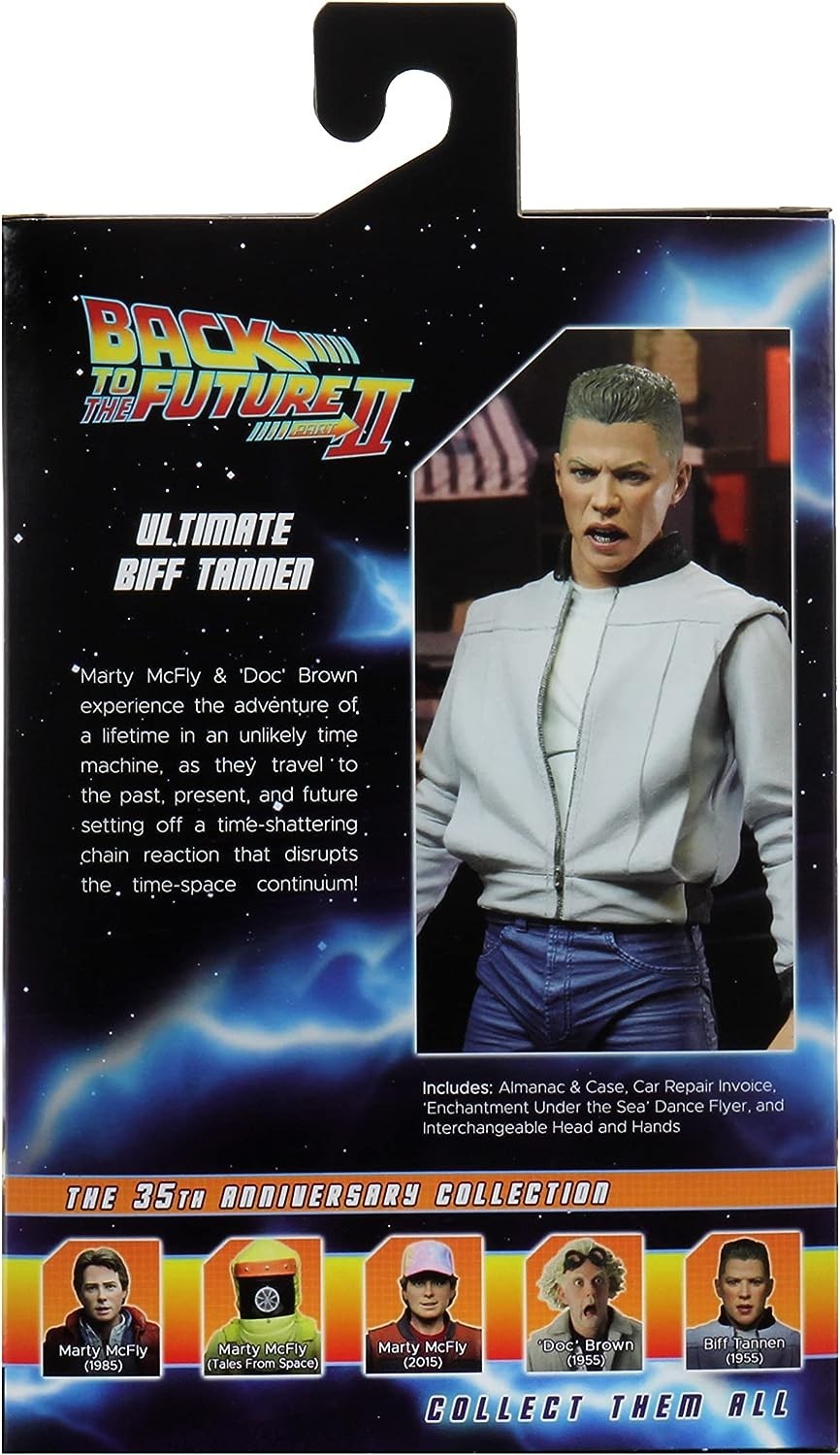 Biff Tannen es el matón de instituto más famoso del cine de los años ochenta. Haciéndole la vida imposible a George McFly y después tratando de hacer lo mismo con su hijo Marty, Biff finalmente y en varios momentos temporales de su historia, recibió su merecido. La marca Neca y su línea de Reel Toys nos traen al Biff Tannen de los años cincuenta de Regreso al futuro II, la secuela dirigida por Robert Zemeckis. Este Biff de 18 cms viene en una espectacular caja de coleccionista que lleva la portada del almanaque deportivo en la parte frontal e incluye accesorios como: tres manos adicionales, cabeza intercambiable, almanaque deportivo y factura del mecánico para su ‘bebé’. Está hecho de un PVC que aguantaría varios viajes en el tiempo en el capó del DeLorean. Biff lleva su ropa de los cincuenta y está dispuesto a ser un adversario a tener en cuenta para Marty, George y Doc Brown. ¡Nos vemos en el futuro!