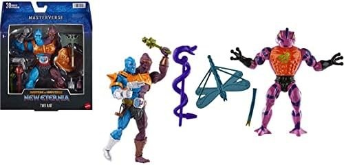 La legendaria saga de Masters of the Universe, de Mattel, nos trae a un nuevo personaje desde los confines del universo para que puedas jugar con él o exponerlo en tu estantería. Se trata nada más y nada menos que de Two Bad. Este villano cuenta con dos cuerpos fundidos en uno, para arrasar por partida doble con He-Man y sus aliados. Mide unos 20 cms e incluye accesorios como dos mazos, pistola, cetro, escudo y dos manos intercambiables. Pertenece a la línea Masterverse de Masters of the Universe New Eternia. Que empiece la batalla por Eternia…