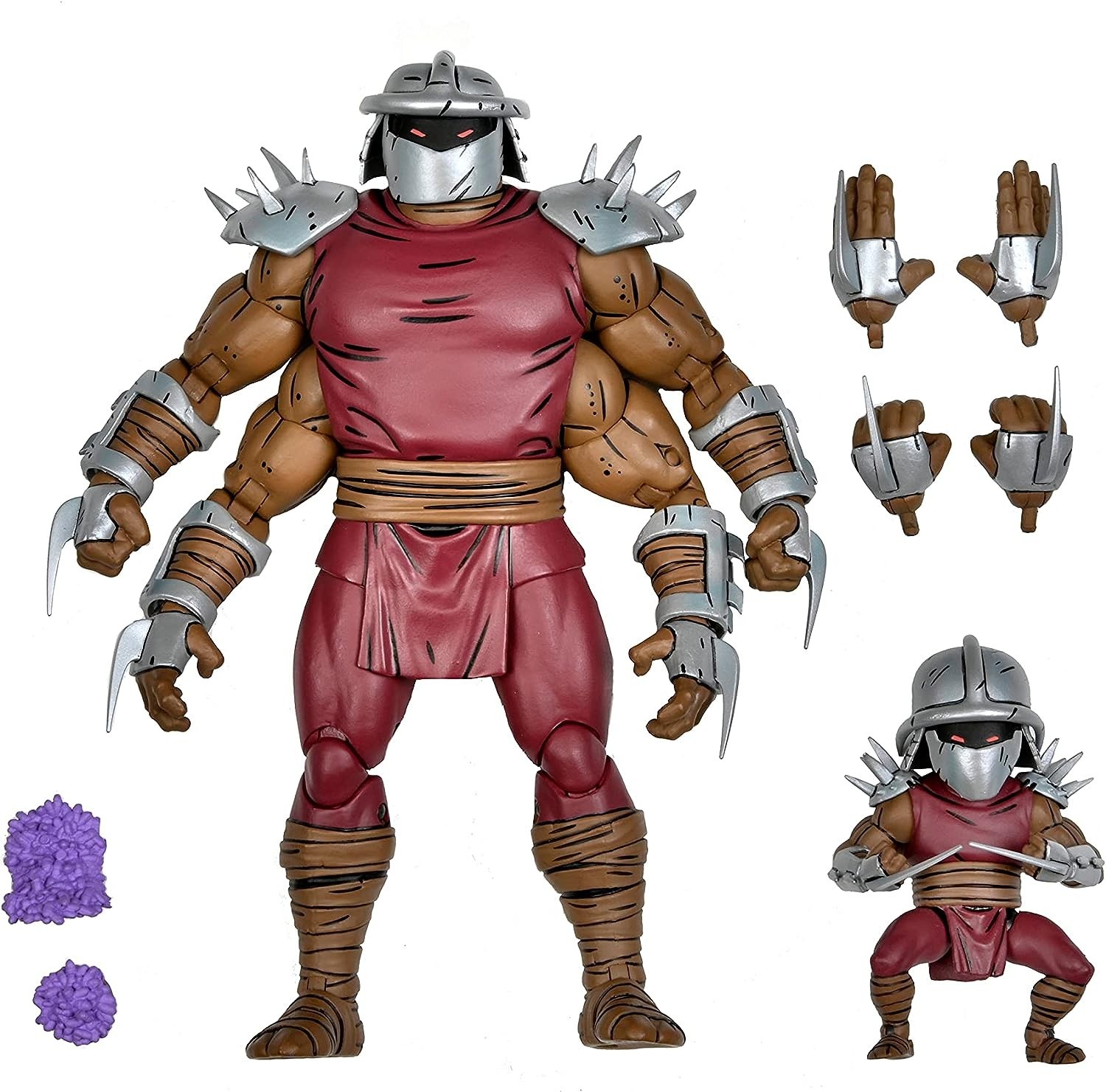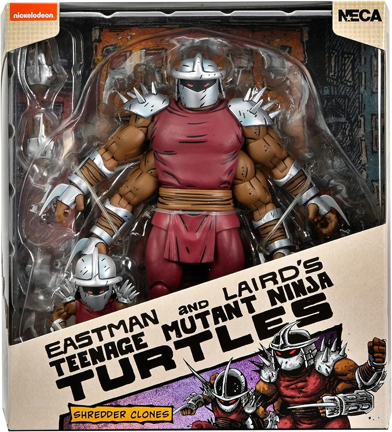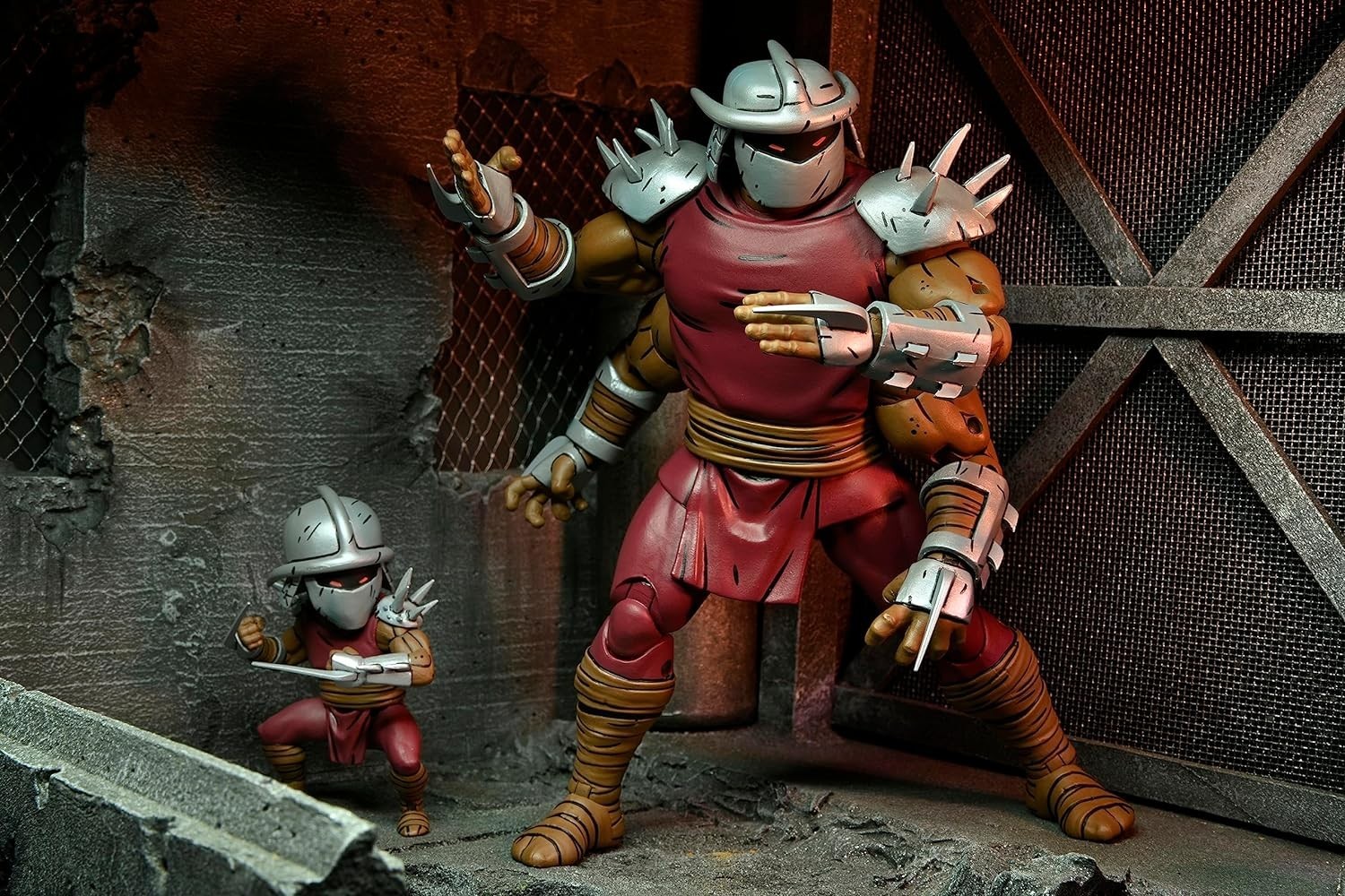 Shredder es el icónico villano de las Tortugas Ninja Mutantes Adolescentes (TMNT). Con su imponente armadura metálica, garras afiladas y máscara amenazante, Shredder encarna el malvado líder del Clan del Pie. Su obsesión por derrotar a las tortugas y controlar Nueva York lo convierte en un antagonista formidable y reconocible en la cultura pop. Esta figura de 17 cms de Shredder viene acompañada por un clon de 7 cms. Ambos pertenecen a la línea de TMNT de Nickelodeon que Neca y su línea Reel Toys han creado para celebrar el mundo de las Tortugas Ninja. Tienen un acabado de estilo ‘cartoon’ que las hace aún más especiales. Incluye accesorios como dos pares de manos adicionales.