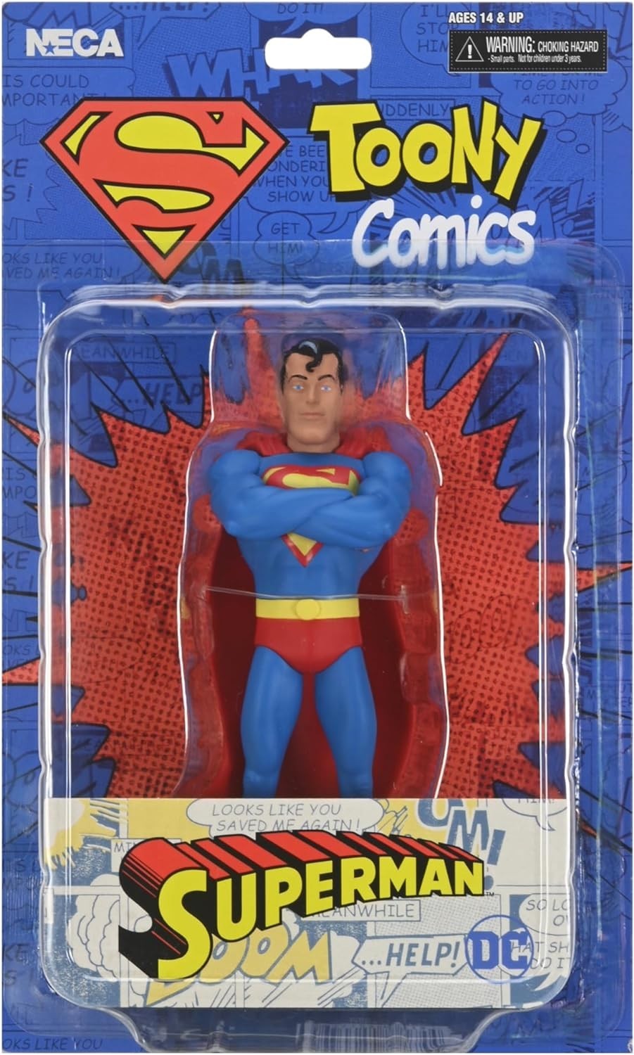 Esta figura de Superman de 15 cms nos trae la versión más clásica del personaje. Pertenece a la línea Toony Comics de la legendaria marca de Neca, y está hecha de PVC de gran calidad con acabado mate. Viene en un blíster colorido que es un puro homenaje a los cómics de DC. Captura al icónico superhéroe en una postura poderosa, de pie y con los brazos cruzados. Con su traje azul, capa roja y el emblemático escudo "S", esta figura destaca por su diseño detallado y fiel a los cómics originales. Ideal para coleccionistas y fans de DC, es una representación perfecta del Hombre de Acero en un formato compacto y coleccionable.