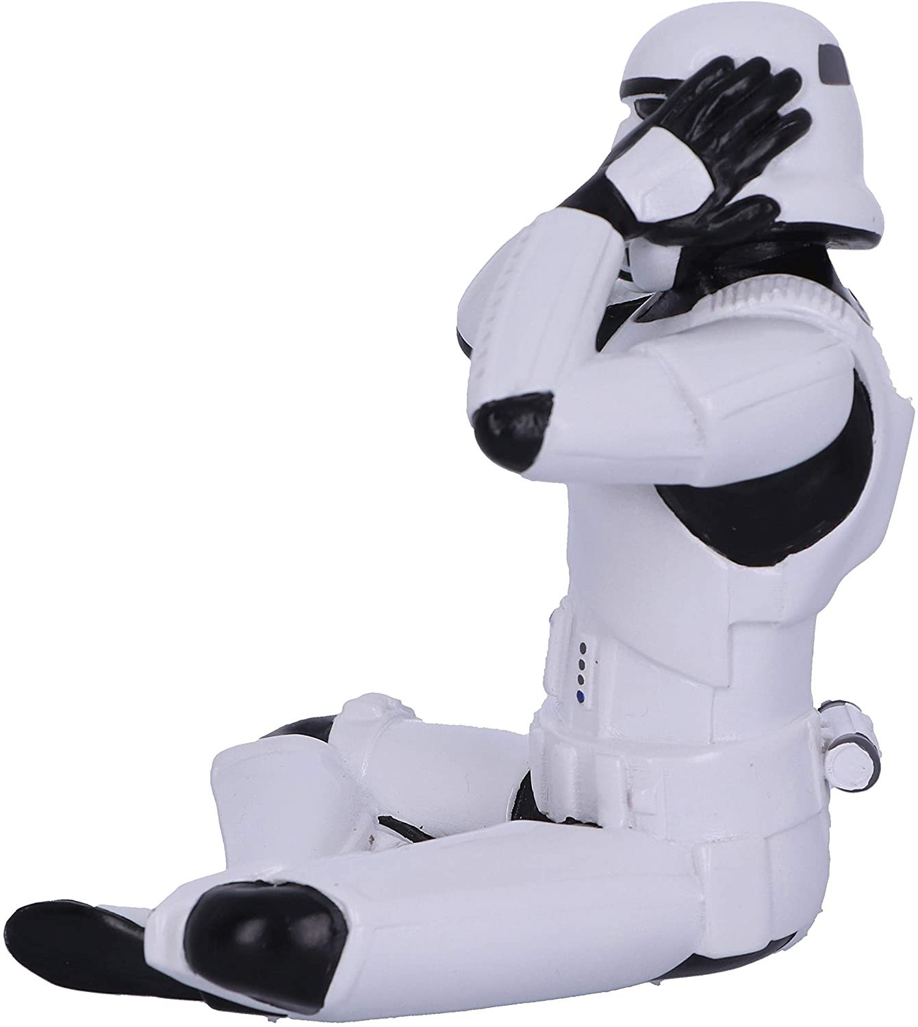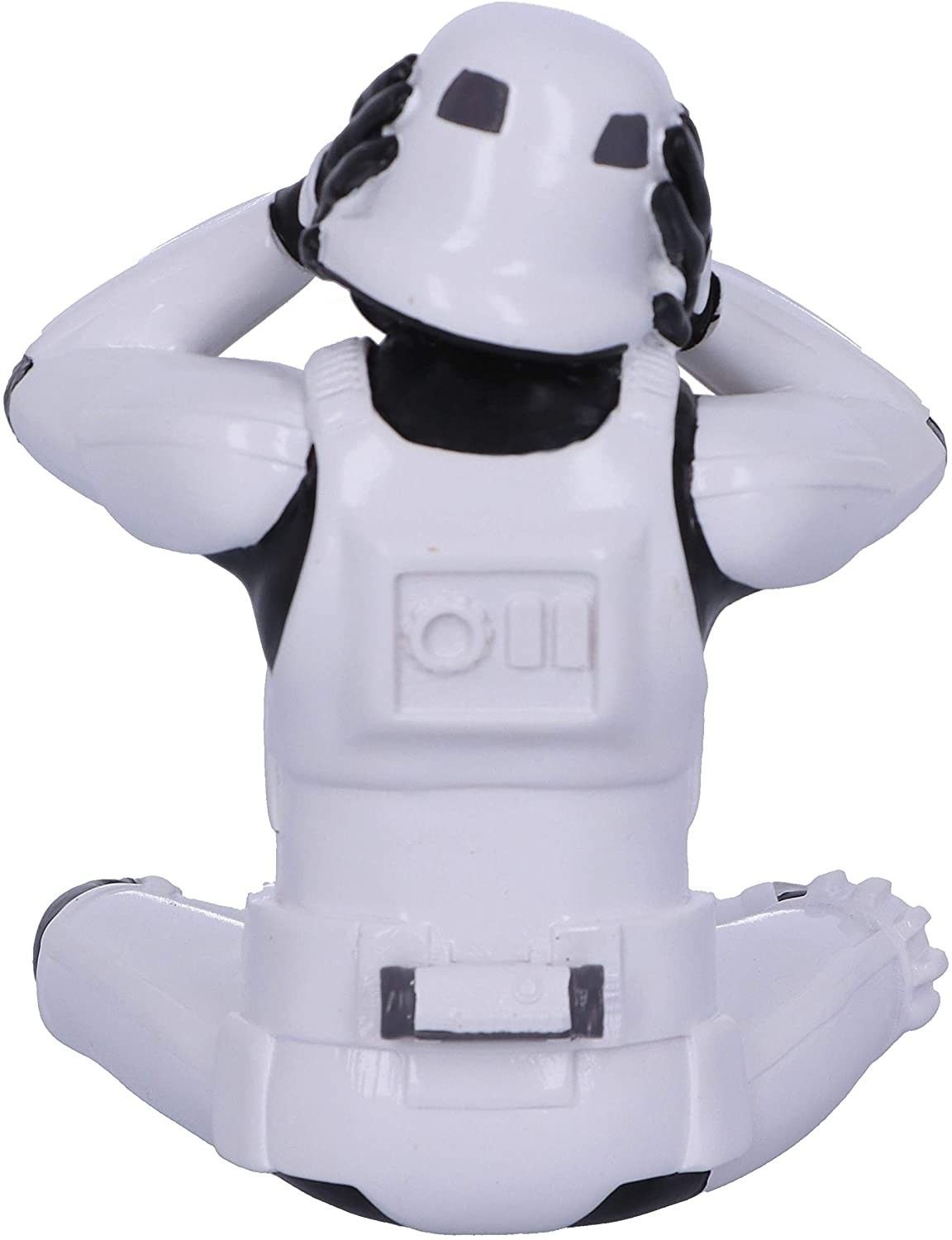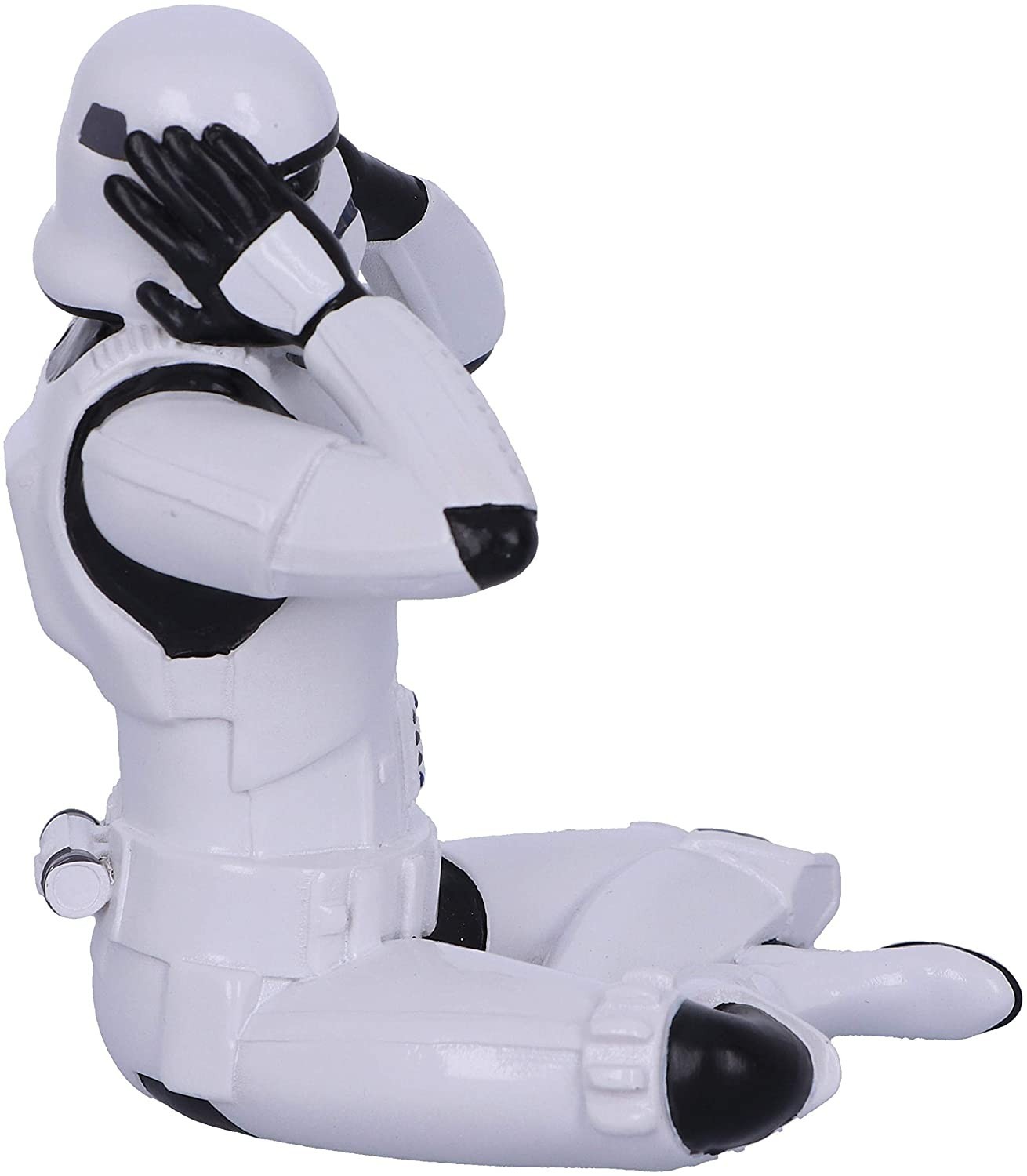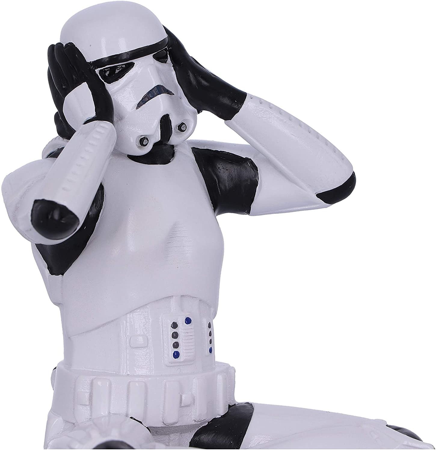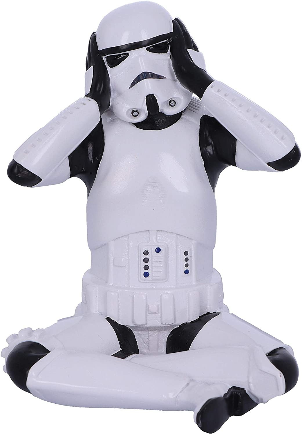 ¿Conoces a los tres monos sabios? Estos tres monos místicos representan un mensaje que también encontramos en lugares como el Castillo de Loarre en Huesca. Su traducción procede del código moral chino de 'Santai', y se asoció con 'no ver el mal, no escuchar el mal y no decir el mal'. Una parte de esta filosofía ha sido llevada al universo Star Wars con la estatua del Stormtrooper 'Hear No Evil' que está sentado en el suelo tapándose los oídos. Una pieza de Nemesis Now hecha de resina y de 10 cms de altura aproximadamente. Original, filosófica, pop, una mezcla genial.