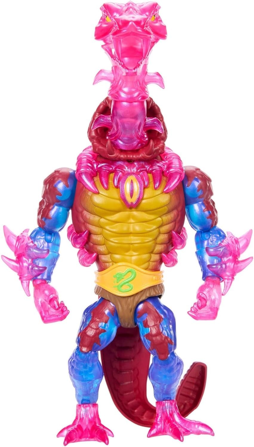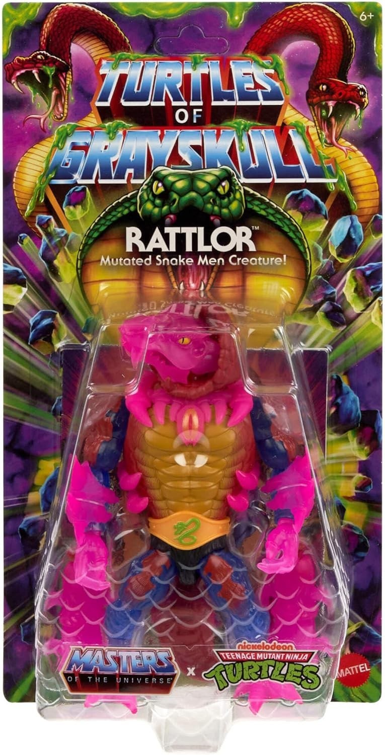 ¡El maestro del sigilo y los sustos está aquí! Rattlor, el aterrador guerrero serpentino, llega en todo su esplendor a la épica colección Turtles of Grayskull de Mattel, donde Eternia y las Tortugas Ninja chocan en un crossover legendario. Esta figura de 14 cms combina su diseño clásico con un toque moderno, destacando un elegante tono rosa translúcido en su cuerpo, que le da un aire venenoso y sobrenatural. Incluye dos extensiones de cuello intercambiables, perfectas para recrear su famoso ataque sorpresa, ya sea con un salto corto o un estirón impresionante que hará temblar tanto a los héroes de Eternia como a los ninjas mutantes. Además, trae consigo un mini-cómic exclusivo, donde Rattlor demuestra por qué es uno de los guerreros más letales de la Horda Serpiente. ¡Articulado, detallado y listo para sembrar el terror en este increíble cruce de universos!