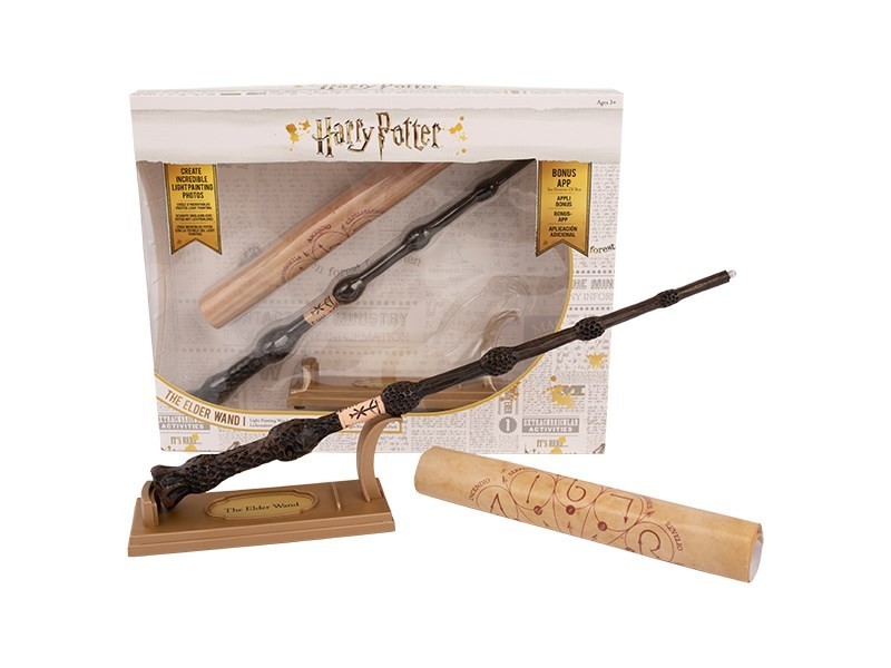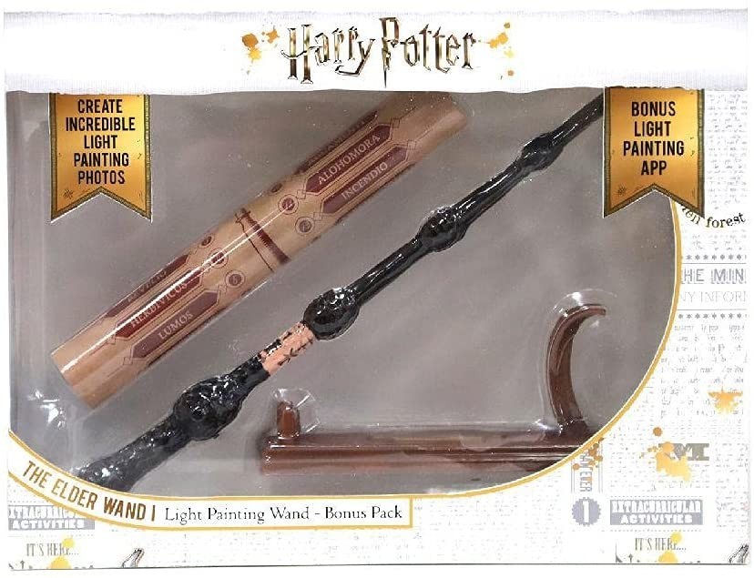 Si quieres tener una réplica de la varita mágica de Albus Dumbledore pero con un toque original y aún más mágico, te traemos esta maravilla creada por Wow Stuff. Escaneada con láser a partir de la varita original de la película, esta pieza ha sido pintada a mano y moldeada en una resina de alta calidad. Lo novedoso es que esta varita tiene en la punta una luz LED que si la usas con la app gratuita que se puede descargar para IOS y Android podrás dibujar con luz y escribir palabras o hechizos en el aire. Comparte tus fotos creando dibujos con luz con esta varita de licencia oficial de Wizarding World. En la caja también viene una peana para colocar la varita o el teléfono y una hoja de pergamino con hechizos.