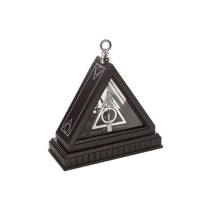 El símbolo de las reliquias de la muerte fue uno de los iconos asociados a la saga mágica de Harry Potter que nos dio las últimas películas. Este colgante de aleación de zinc con cadena de metal es una réplica exacta del colgante de Xenophilius Lovegood, padre de Luna Lovegood en las películas de Warner Bros. Esta exquisita pieza incluye una original y preciosa caja negra negra triangular con cristales para exponer el colgante como la auténtica reliquia que es. Sus medidas aproximadas son 17 x 17 x 9 cms. The Noble Collection es la marca detrás de este producto de licencia oficial, si te suena el nombre ya sabrás que son expertos en crear piezas que rezuman auténtica magia y calidad.