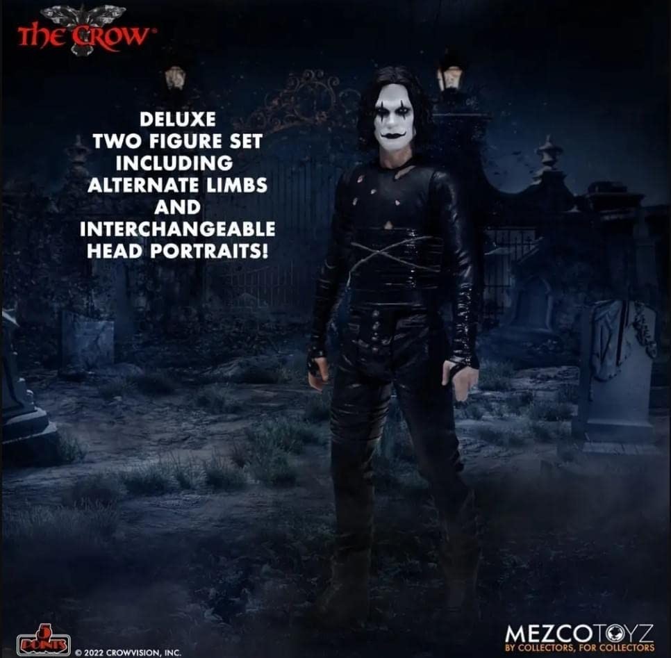 El Cuervo, interpretado por Brandon Lee, llega en un exclusivo pack de dos figuras a tu colección de figuras cinéfilas. Estas dos góticas figuras son dos variaciones del protagonista de la película dirigida por Álex Proyas. En una de las figuras El Cuervo viste su mítica gabardina negra, y en la otra va igual que en el póster de la película, con la camiseta de manga larga negra. La figura de la gabardina tiene brazos intercambiables e incluye uno que está señalando. a figura sin gabardina incluye dos pares de piernas intercambiables, además, las dos cabezas, una con sonrisa y otra sin son intercambiables entre ambas figuras. Llévate a uno de los personajes más icónicos de los años noventa con este fantástico y gótico pack de dos figuras de 9 cms que nos trae Mezco Toyz y su marca 5 Points.
