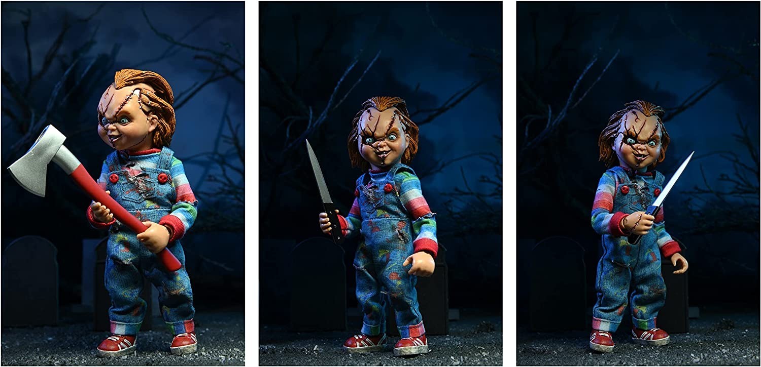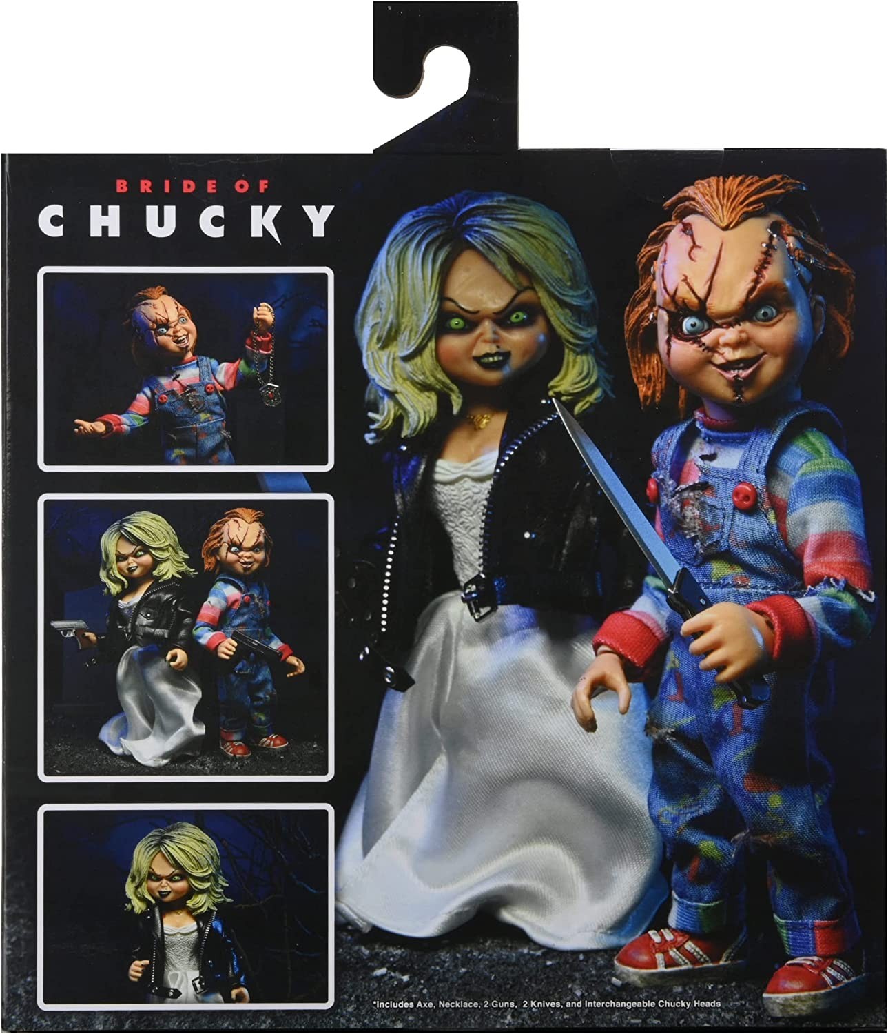 Incluso el muñeco diabólico más sanguinario del cine encontró a su media naranja. Chucky y Tiffany, la pareja de muñecos protagonistas de La Novia de Chucky, llegan a tu colección de figuras articuladas gracias a Neca y su exclusiva línea Reel Toys. Estos dos mini psicópatas miden unos 14 cms y vienen acompañados por un buen surtido de accesorios para sembrar el mal por donde pasan: dos cuchillos, un hacha, dos pistolas y un amuleto de su amor eterno. Están hechos de PVC de gran calidad con su ropita hecha a medida y un trabajo de pintura que roza la perfección. Además, Chucky incluye una segunda cabeza intercambiable con una expresión aún más sádica si cabe. Llévatelos en su fantástica caja con ventana y expón a estos dos criminales en tu mejor lugar.