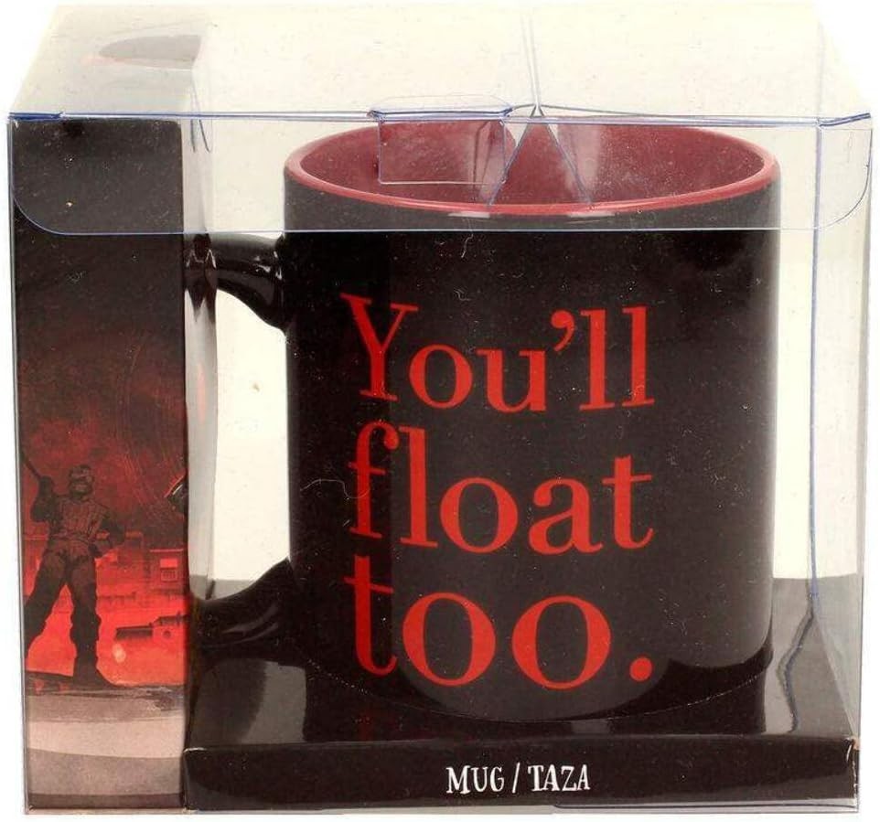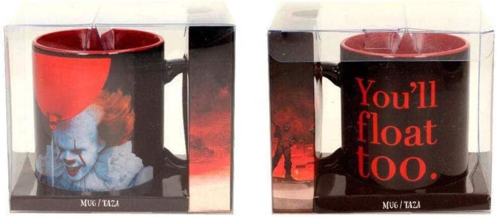 Tú también flotarás cuando bebas de esta taza de licencia oficial de “It” y Warner Bros. Pennywise, el terrorífico villano de a película que adaptaba la novela de Stephen King, sujeta un globo en la ilustración de esta taza que también lleva la frase: “You’ll float too” escrita. Es de colores negro y rojo y es apta para lavavajillas y microondas. Está hecha de cerámica y tiene una capacidad aproximada de 320 mls.