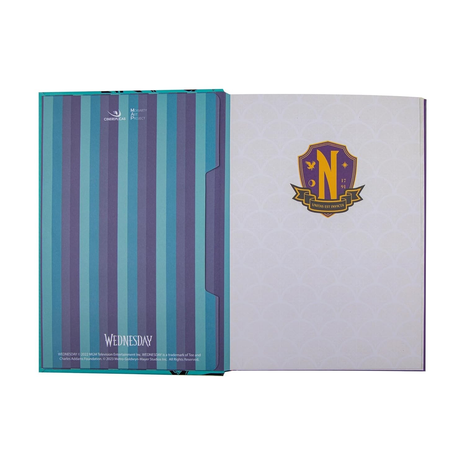 Apunta todas las ideas que se te ocurran, o toma todas las notas que necesites, en este exclusivo cuaderno de 14,5 cms de ancho x 21 cms de alto de “Wednesday”, la exitosa serie de Netflix protagonizada por Jenna Ortega. La serie contaba un fragmento en la vida de Miércoles Addams, en concreto cuando estudiaba en Varsity y las aventuras que corría en la institución. Cineréplicas ha creado este cuaderno de tapa dura de licencia oficial y colores vivos. Está inspirado en la “amistad” entre Wednesday y Enid. La portada está dedicada a Wednesday y sus colores característicos, con una ilustración del perfil del personaje, y la parte de atrás hace lo propio con Enid. Tiene 160 páginas y tiene un patrón de líneas para que todas tus anotaciones queden perfectas.