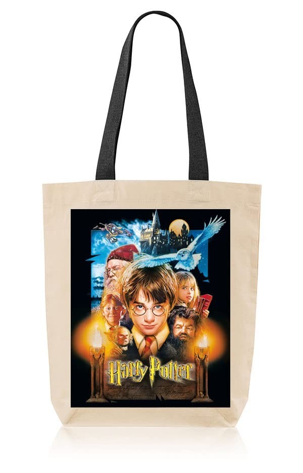 Tote bag hecha de algodón 100% y con asa de costura resistente. Sus medidas son 39 cms de largo (sin contar el asa) y 36 cms de ancho. La bolsa lleva un diseño realizado por impresión digital de la primera película de la saga cinematográfica de Harry Potter.