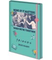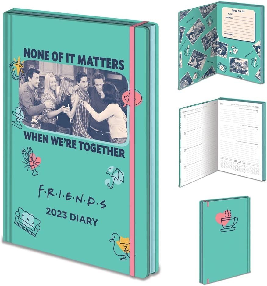 Pyramid Internacional ha hecho buen uso de su nombre y ha viajado hasta Nueva York para traernos la exclusiva agenda anual de ‘Friends’, la sitcom más famosa de los años noventa. Tiene unas medidas de 13 x 19 cms y tapa dura. La portada cuenta con una entrañable foto de los seis protagonistas rodeada de motivos decorativos y de la frase ‘None of it matters when we are together’. Evita que tu agenda se abra en lugares indebidos con la goma rosa que tiene y que complementa tan bien el color verde azulado de las tapas. Es un producto de licencia oficial con el que podrás tener siempre presentes a los personajes de ‘Friends’ cada vez que te planifiques el día.