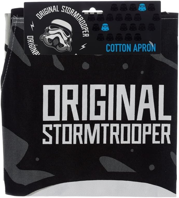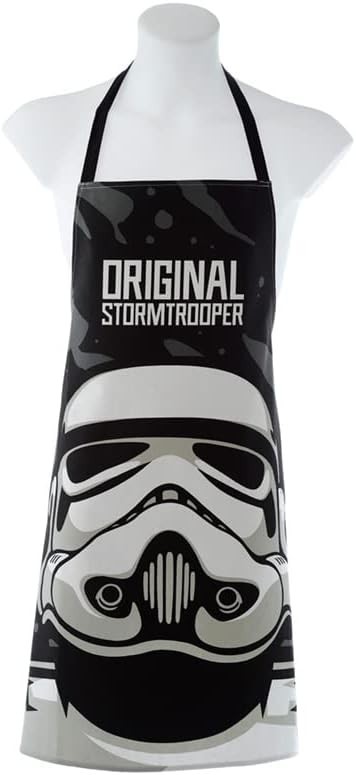 La marca Original Stromtrooper, de Shepperton Studios es única en el sentido de que parte de los diseños y moldes originales usados en la trilogía original de Star Wars. Podríamos decir que es la marca ‘Gran Reserva’ en lo que se refiere a artículos que tienen que ver con los Stromtroopers (Soldados Imperiales o Soldados de Asalto). Creado por Puckator y con licencia oficial de Original Stormtrooper, este delantal será el complemento ideal para todos esos fans del universo creado por George Lucas que vayan a ponerse delante de los fogones. Está hecho de polialgodón y es de color negro con un dibujo de un primer plano de un Stormtrooper en pose orgullosa. Prepara tus mejores barbacoas imperiales con tu nuevo delantal y verás como ni el mismísimo Emperador Palpatine se resiste a tus dotes culinarias. Tiene una doble cinta trasera para atárselo como es debido y no tropezar por los pasillos de la Estrella de la Muerte.