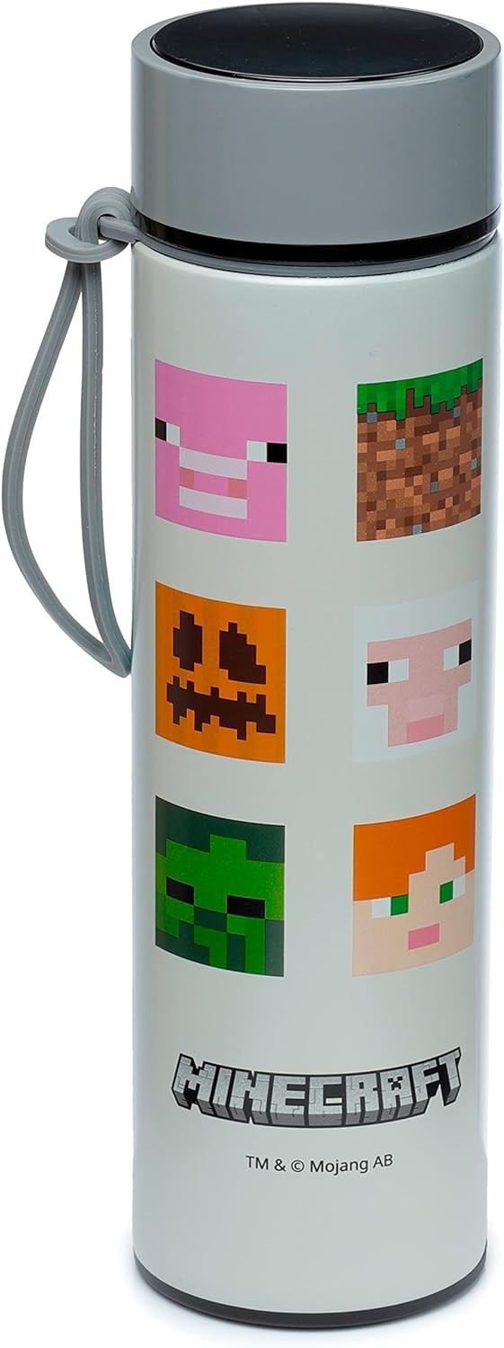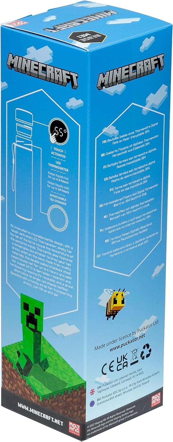 Puckator ha aceptado la misión de Mojang Studios y nos ha traído una espectacular botella térmica de 450 mls de capacidad que además tiene un termómetro digital en la tapa. Mantiene los líquidos calientes hasta seis horas y los fríos hasta veinticuatro horas. En su superficie blanca tiene ilustraciones de las caras de varios personajes del famoso videojuego. Está hecha de acero inoxidable 304 y es resistente a la corrosión, fácil de limpiar, reutilizable y a prueba de goteos indeseados. Viene en una caja temática de Minecraft.